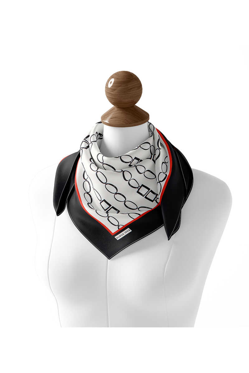 مع وشاح من نسيج التويل الحريري المربّع بنمط سلسلة سوداء من Ecru ، والذي ينعكس في أناقة الحرير الفريدة ، ستشعر بجو الوحدة في جمال مختلف. منتجنا؛ يوفر راحة في الاستخدام مع محتواه من الحرير بنسبة 100٪ وأبعاد 90 × 90 سم.