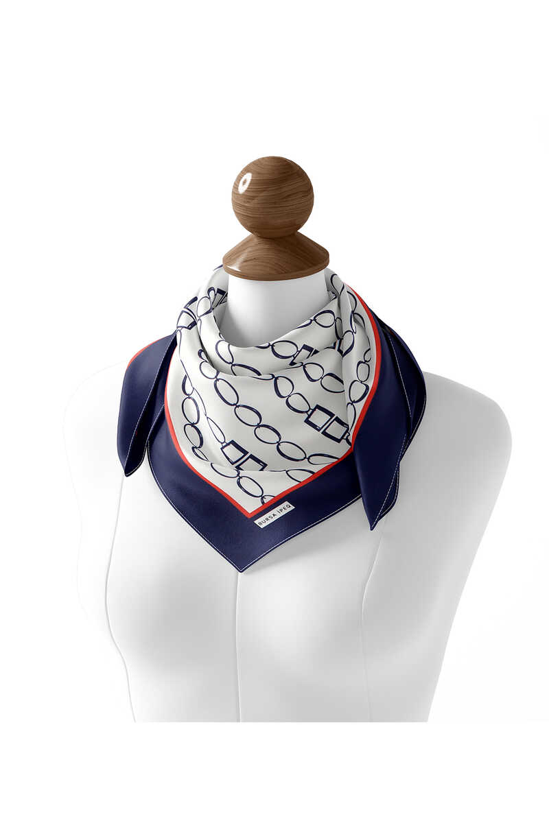 مع وشاح من التويل الحريري المربع بنمط سلسلة باللون الأزرق الداكن Ecru ، والذي ينعكس في الأناقة الفريدة للحرير ، ستشعر بجو الوحدة في جمال مختلف. منتجنا؛ يوفر راحة في الاستخدام مع محتواه من الحرير بنسبة 100٪ وأبعاد 90 × 90 سم.