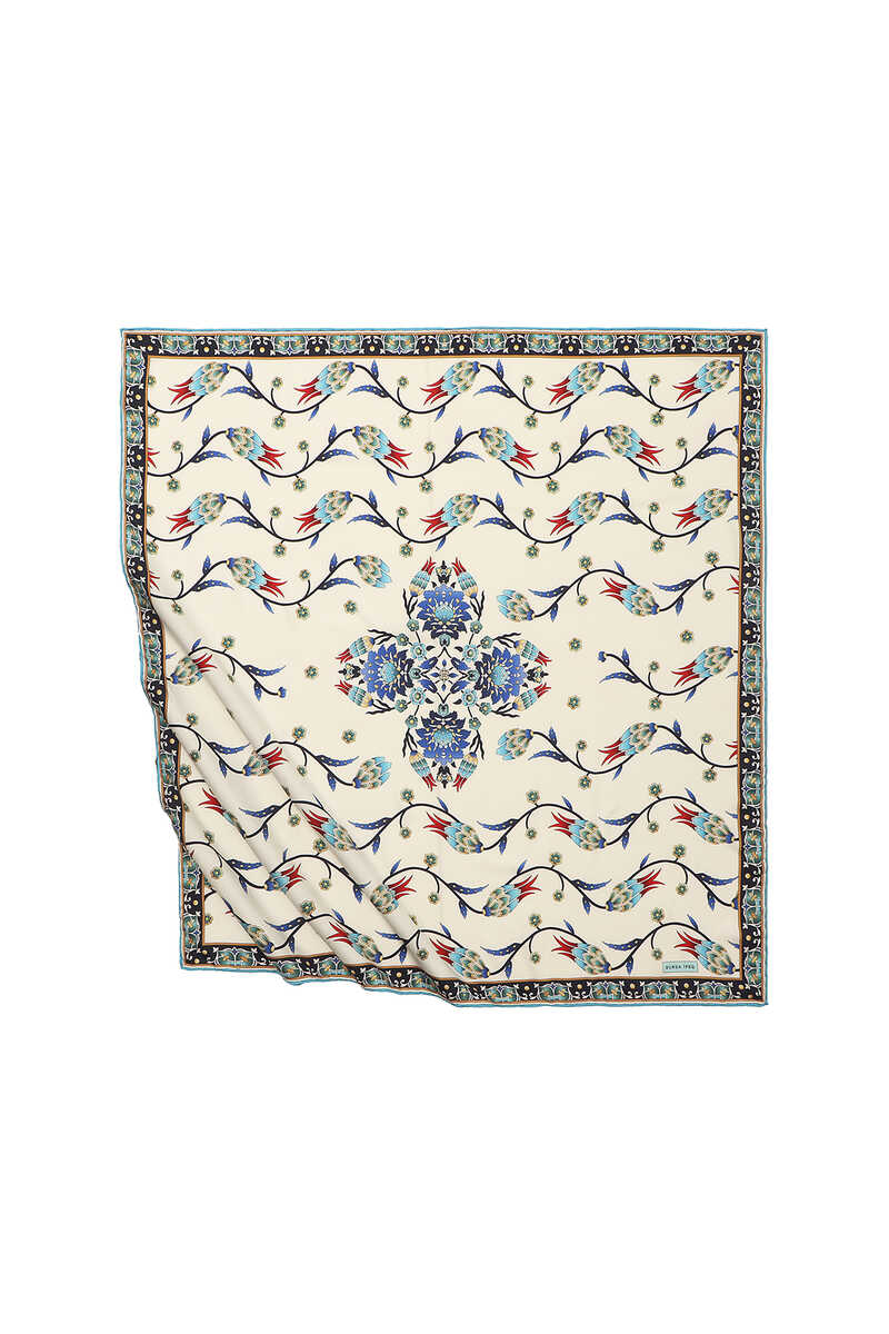 وشاح مربع حريري بنمط توليب بخط فيروزي