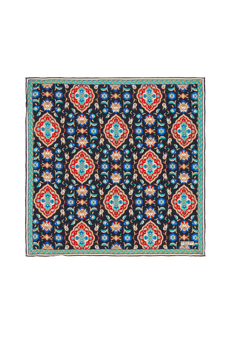 تلتقي الأنماط الأكثر خصوصية لتراثنا التقليدي مع الحرير مصحوبًا بتفسيرات حديثة. شغف المرأة الذي لا غنى عنه هو نموذج الجيب الحريري ذو اللون الأزرق الداكن والأحمر التركي المزخرف بنمط Tile Tulip الفريد ؛ إنه يوفر لك الراحة والأناقة التقليدية مع لمسة سميكة وناعمة وواسعة. إنه يوفر راحة في الاستخدام بفضل محتواه من الحرير بنسبة 100٪ وأبعاده 55 × 55 سم.