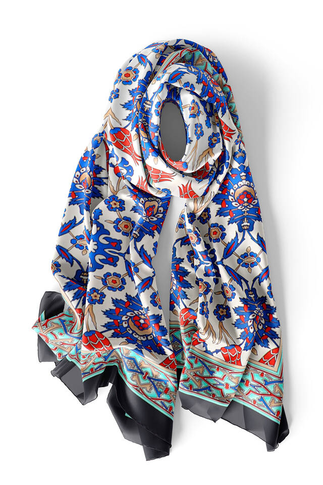 نموذج خاص سيضيف الأناقة إلى أسلوبك ويكمل أسلوبك من اجتماع العمل الأكثر جدية إلى المعرض الفني الأكثر أناقة. يوفر نموذج الفولار الحريري ذو اللون الأزرق الداكن من Saks والمزخرف بنمط التوليب مع الأنماط الجذابة سهولة الاستخدام بمحتواه الحريري بنسبة 100% وأبعاده 55 × 160 سم.