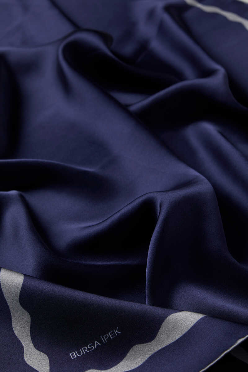 تتويجًا لمظهرك البسيط والبسيط ، فإن وشاح الحرير المربّع ذو الوقفة المستقيمة والكاملة باللون الأزرق الداكن بنمط الموج المائي يروق لجميع المواسم مع مجموعة ألوانه الواسعة في تصميمه بعيدًا عن كل التفاصيل ويرمز إلى التركيز على البساطة. يوفر راحة في الاستخدام مع محتواه من الحرير بنسبة 100٪ وأبعاد 90 × 90 سم.