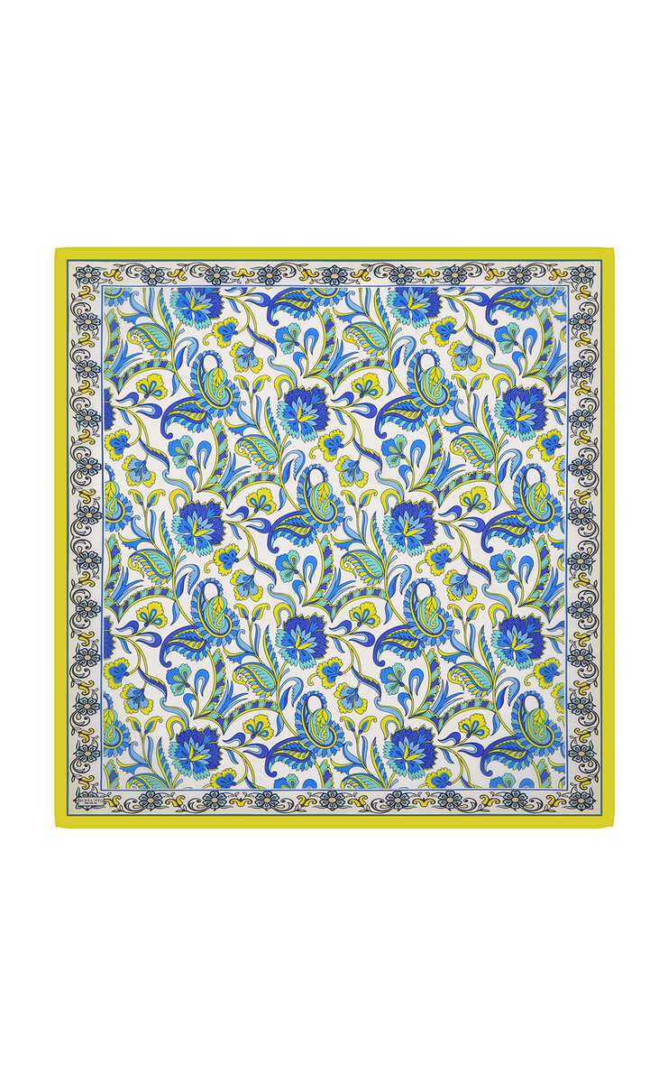 وشاح مربع من الحرير بنقشة زهور باللون الأخضر الحامضي