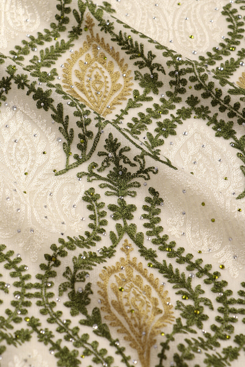 شال من الصوف والحرير مطرز بحجر أخضر كريمي