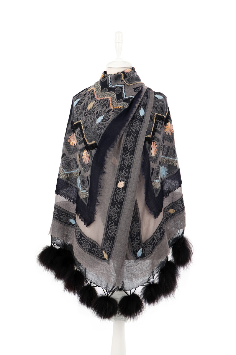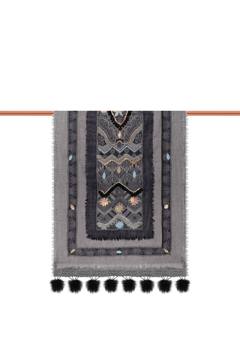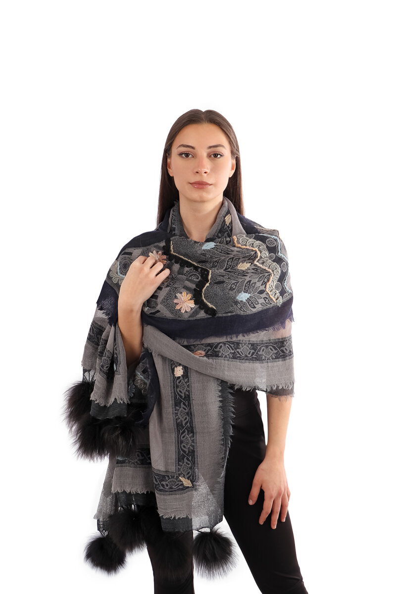 Füme Üç Katlı Yıkanmış Yün Ponponlu Şal