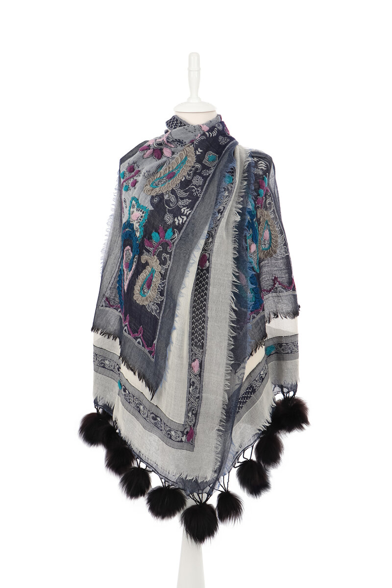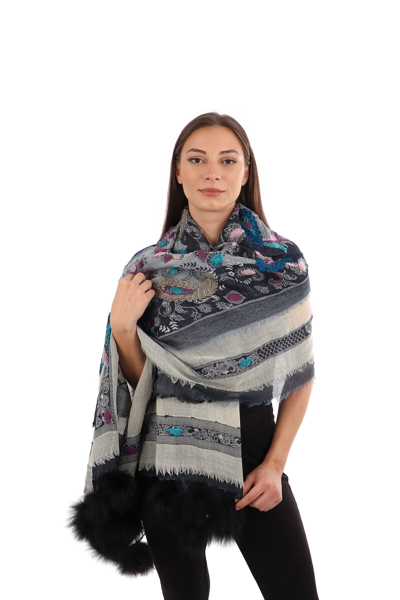 İndigo Üç Katlı Yıkanmış Yün Ponponlu Şal