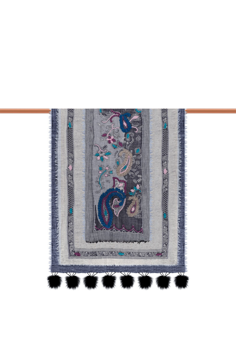 Füme Üç Katlı Yıkanmış Yün Ponponlu Şal