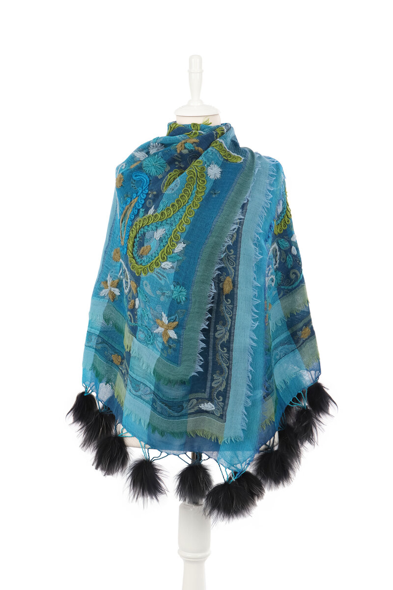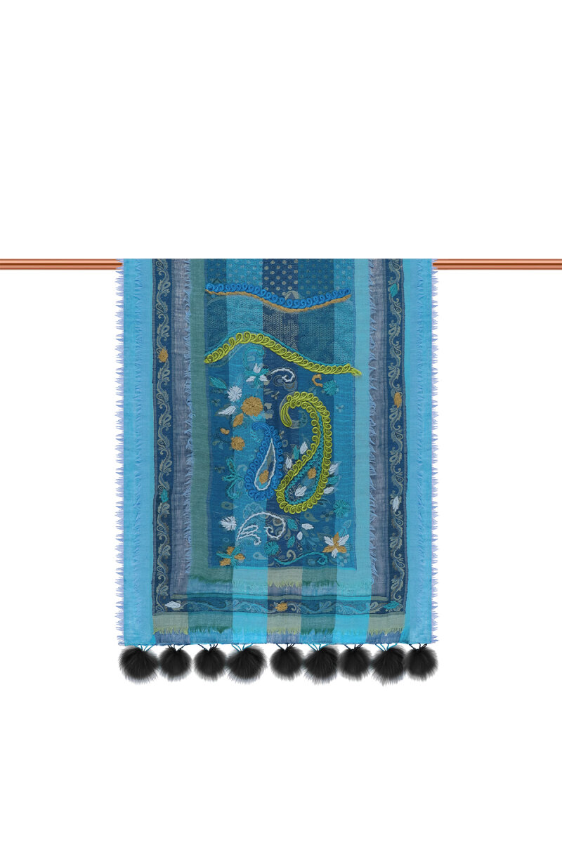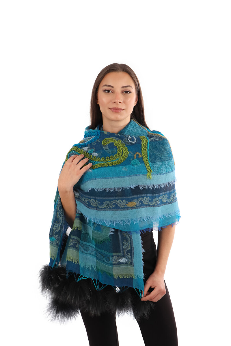 Mavi Üç Katlı Yıkanmış Yün Ponponlu Şal