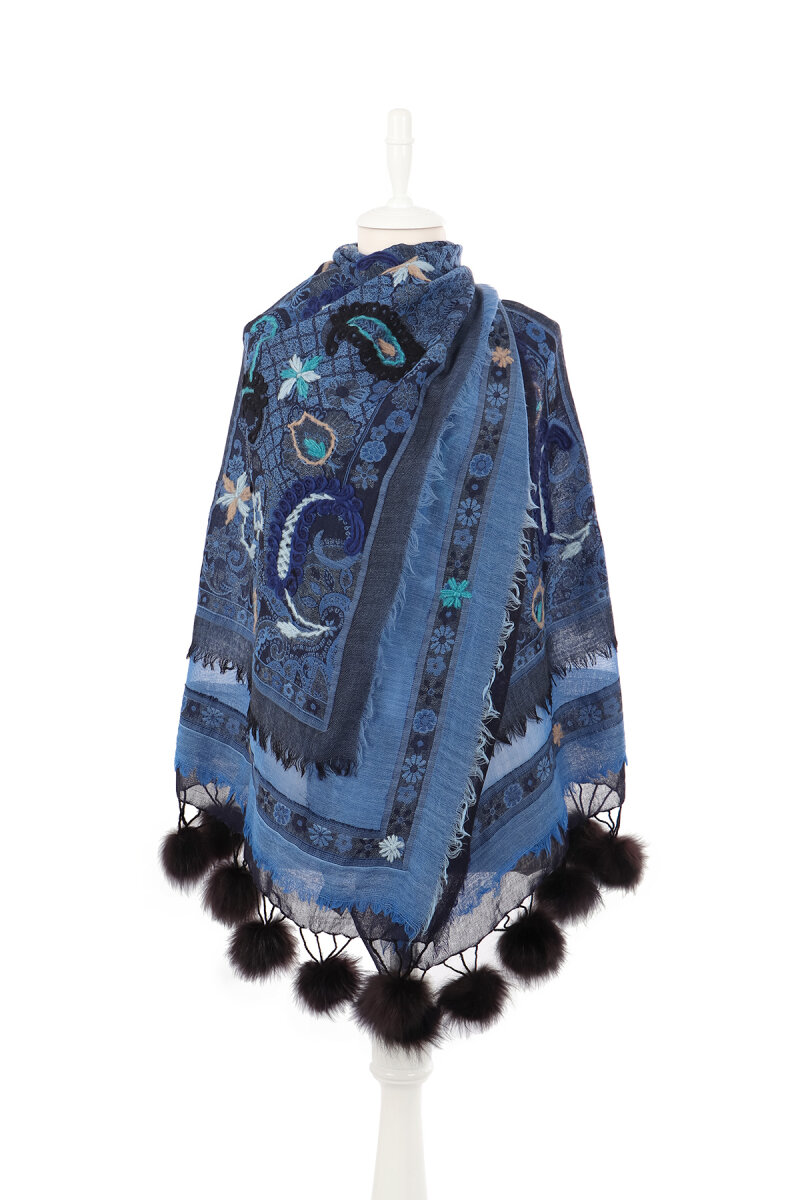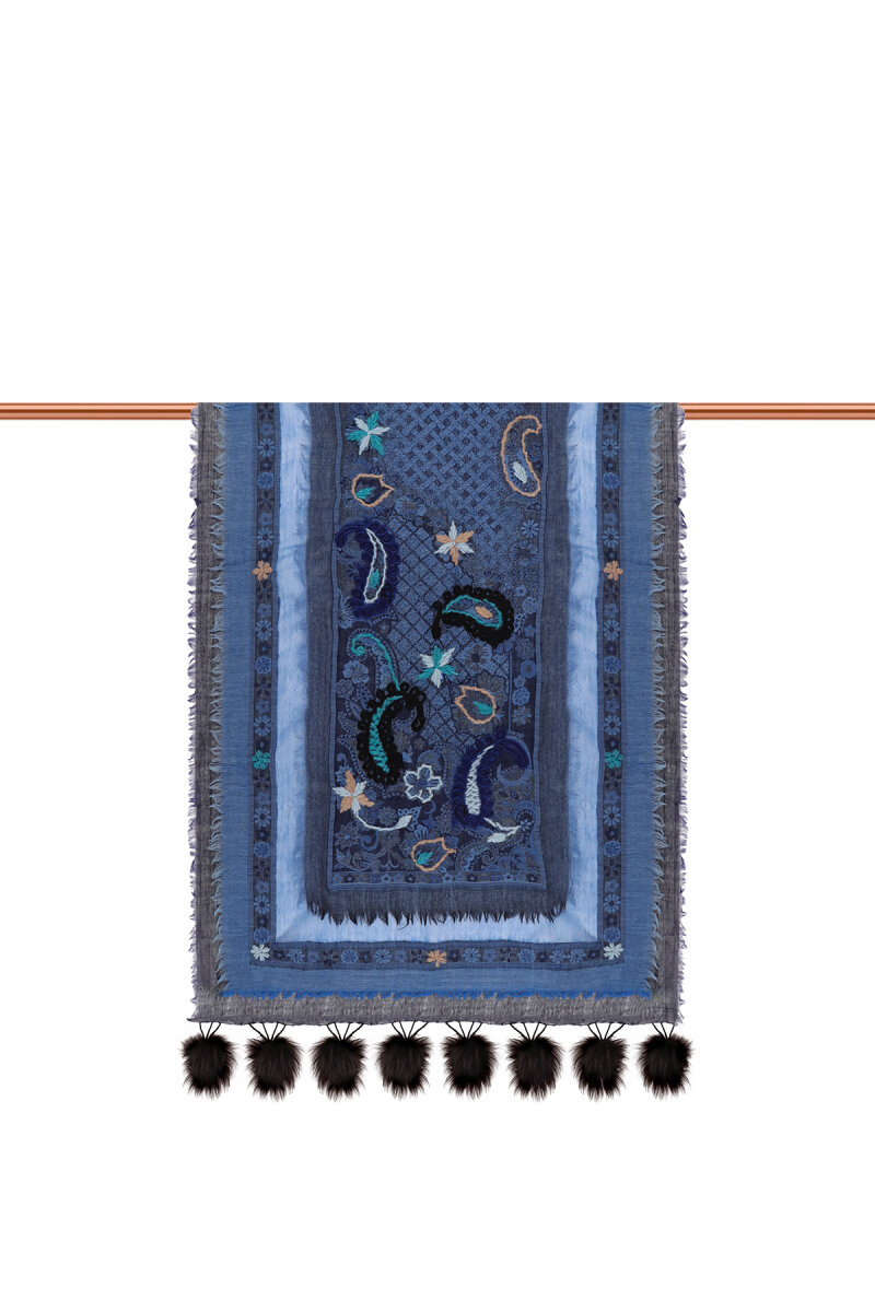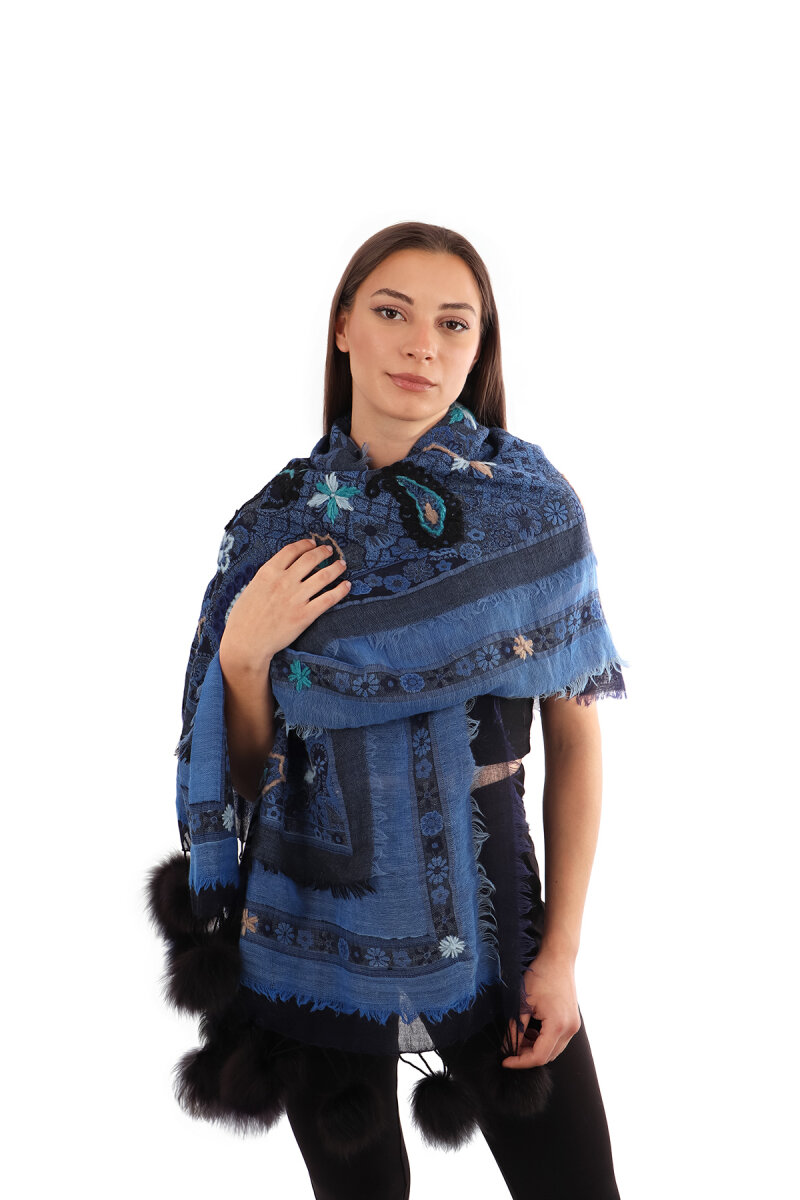Saks Üç Katlı Yıkanmış Yün Ponponlu Şal