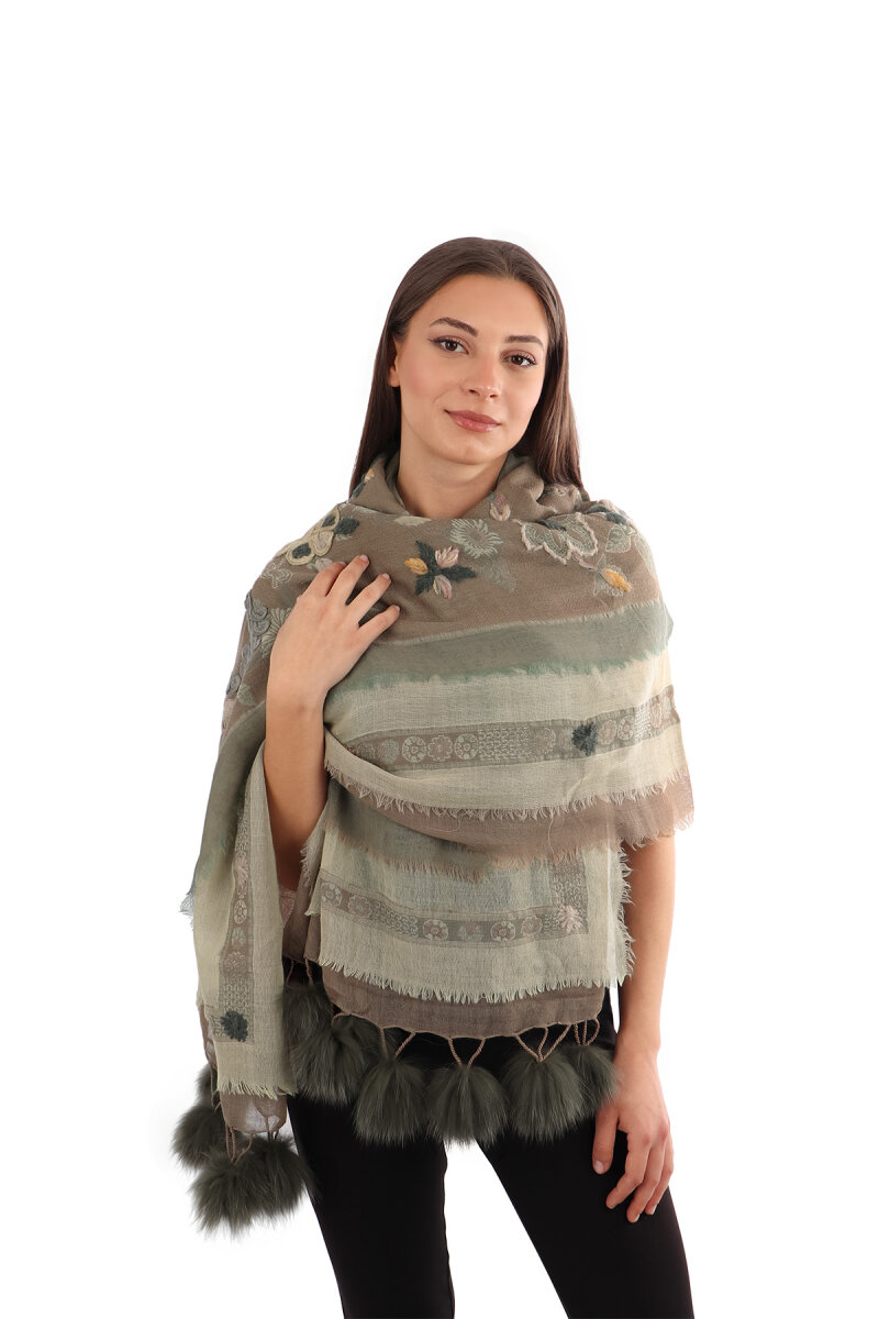 Vizon Üç Katlı Yıkanmış Yün Ponponlu Şal