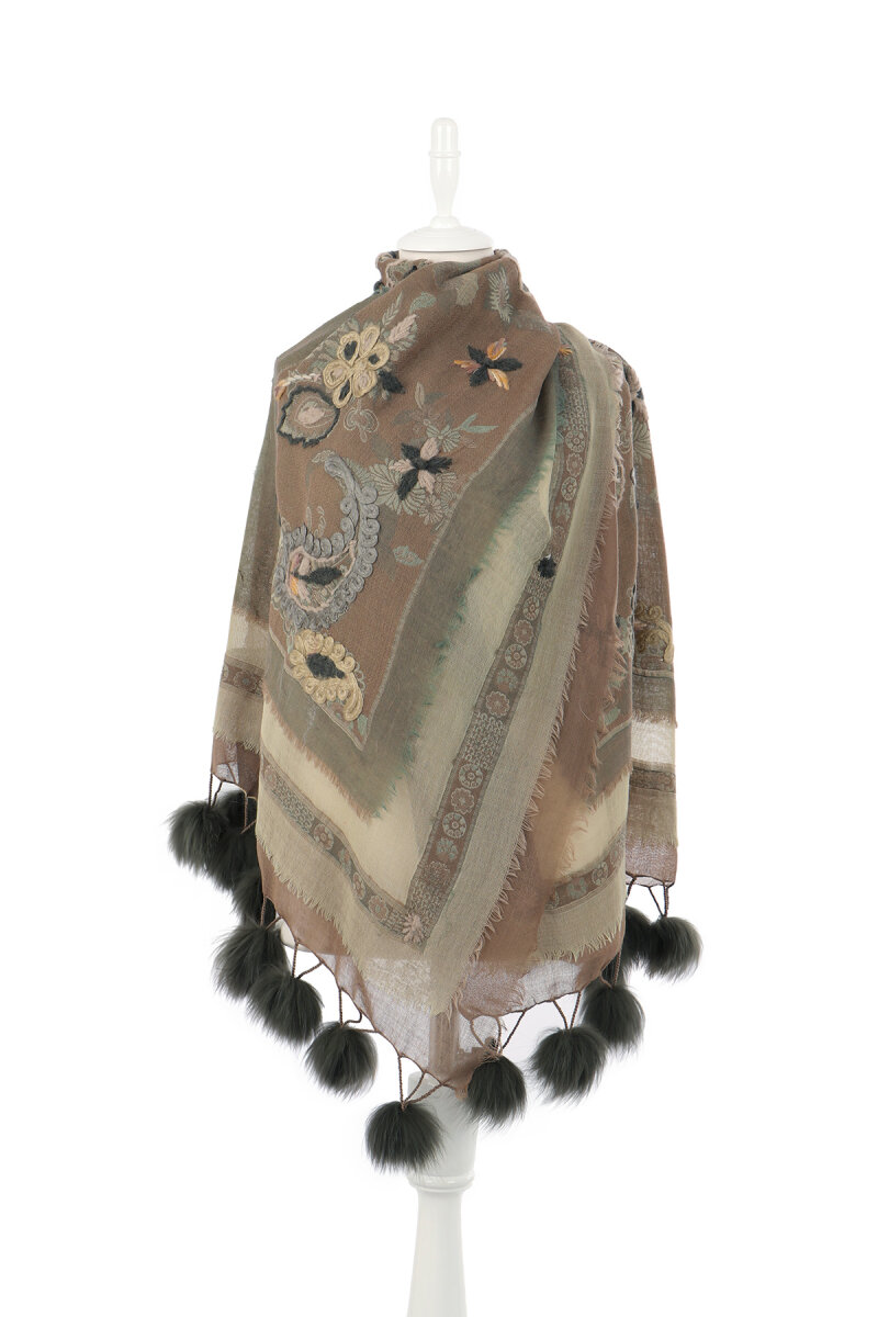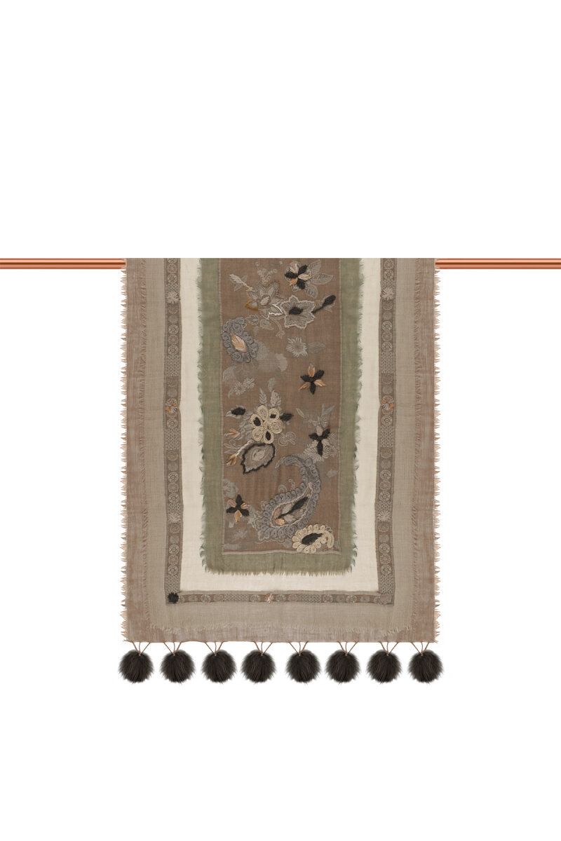 Füme Üç Katlı Yıkanmış Yün Ponponlu Şal