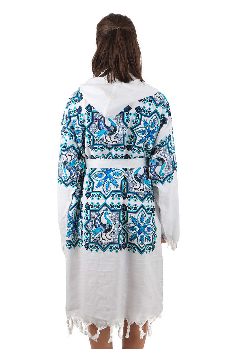 Geleneksel desenler sunan %100 pamuktan imal edilmiş tavuskuşu desenli turkuaz mavi renkli bornoz modellerimiz ile duş ve havuz sonrasında rahat zaman geçireceksiniz.Ürün boyutları standart olarak tasarlanmış olup yüksek su alma kapasitesi sayesinde hamam, duş, banyo ve deniz gibi tüm alanlarda rahatlıkla kullanılabilmektedir.