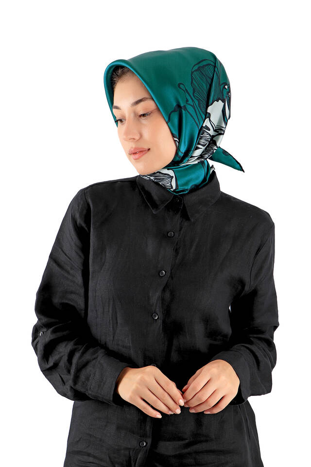 You will feel the atmosphere of integrity in different beauty with the Petrol Green Begonia Pattern Sura Silk Square Scarf, reflected in the unique elegance of silk. Our product; It offers ease of use with its 100% Silk content and 90x90cm dimensions.