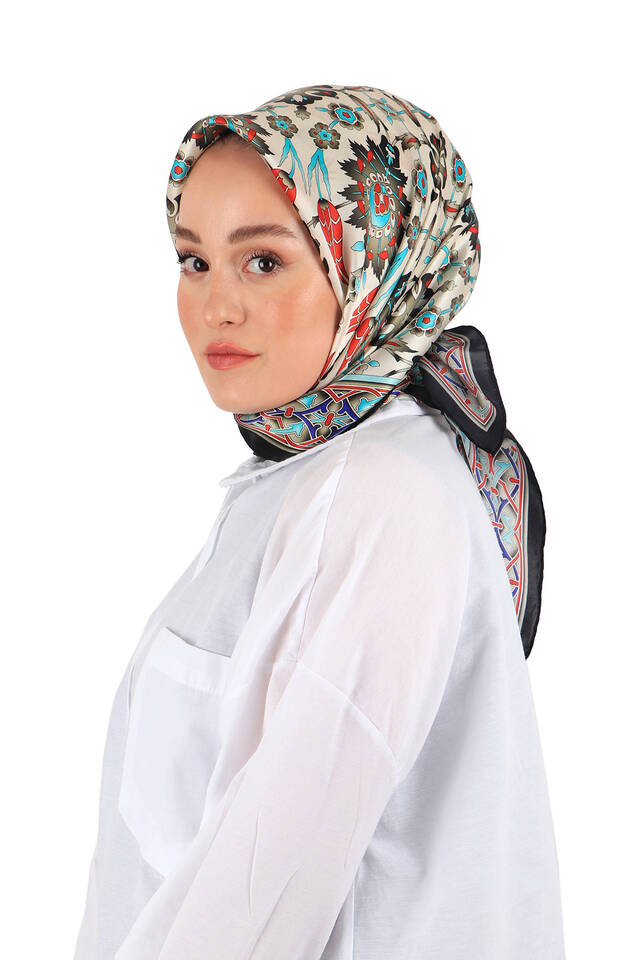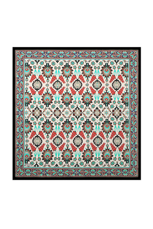 You will feel the atmosphere of integrity in different beauty with the Black and White Tile Tulip Pattern Sura Silk Square Scarf, reflected in the unique elegance of silk. Our product; It offers ease of use with its 100% silk content and dimensions of 90x90cm.
