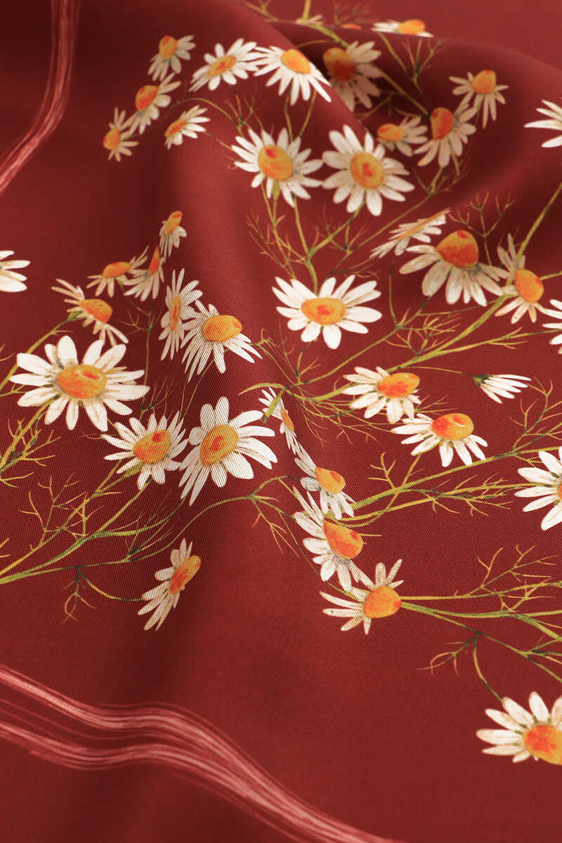 The Burgundy Daisy Patterned Twill Silk Square Scarf, which will increase your elegance and elegance, will be an indispensable part of your wardrobe with its elegant design and quality material. Reflecting the joy and elegance of nature, this Square Scarf will add a special touch to every moment. Our product; It offers ease of use with its 100% twill silk content and dimensions of 90 x 90cm.