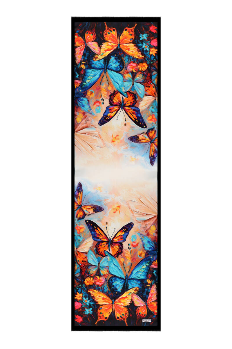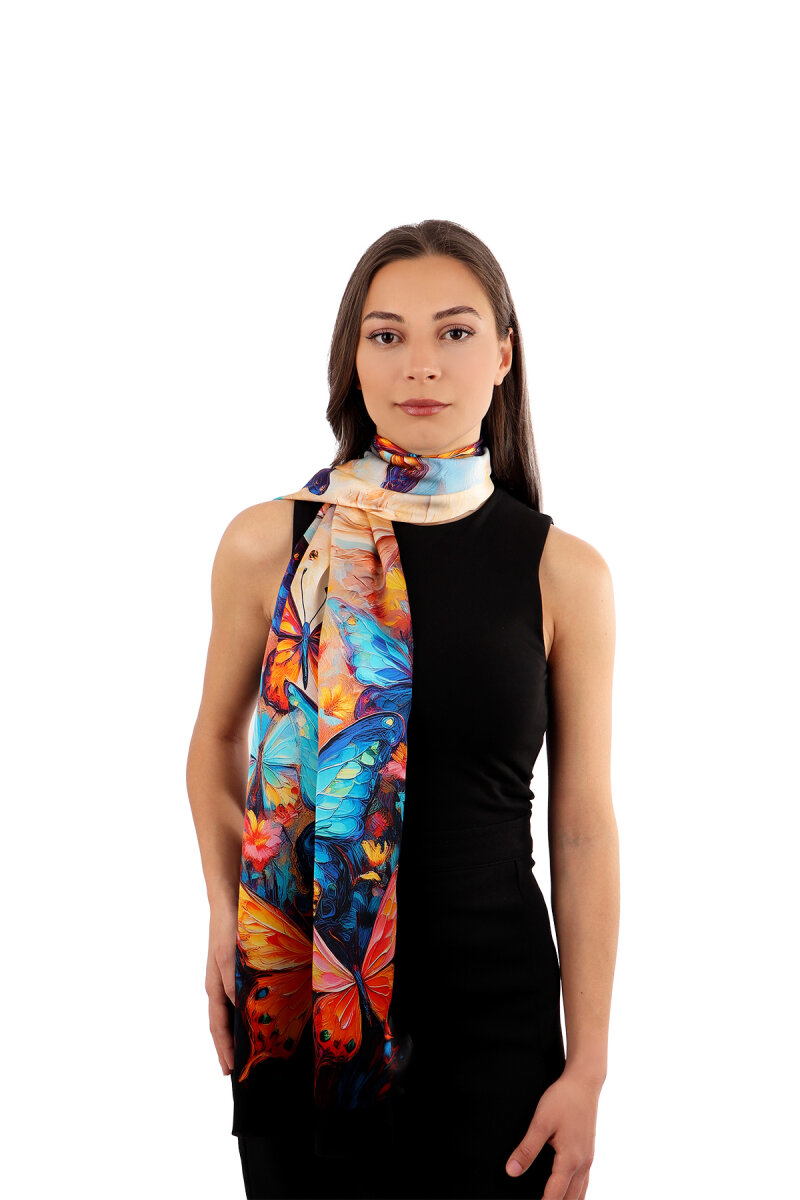 A special model that will add a touch of elegance to your look, from the most serious business meeting to the most elegant art gallery. Our Turquoise Butterfly Pattern Silk Scarf, featuring eye-catching patterns, is made with 100% silk and measures 45x160cm, making it easy to wear.