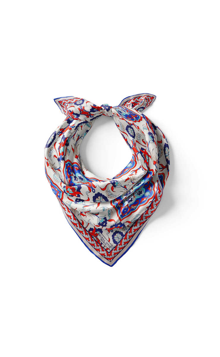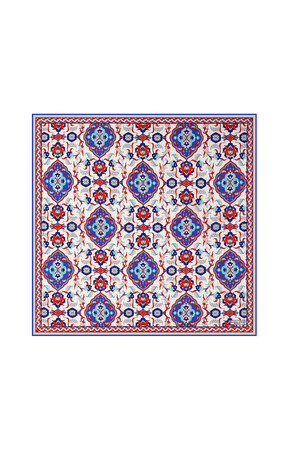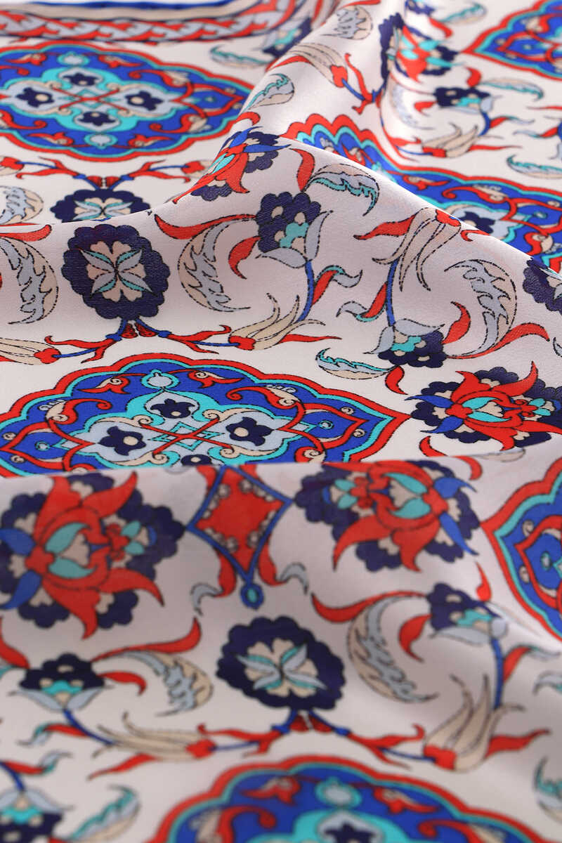 Geleneksel mirasımızın en özel desenleri modern yorumlar eşliğinde ipek ile buluşuyor.Kadınların vazgeçilmez tutkusu eşsiz dokumayla işlenen Türk Motifli Beyaz Saks renkli benzersiz Çini Lale desenli ipek mendil modelimiz; kalın, yumuşak ve ferah bir dokunuşla size hem konforu hem de gelenekselleşen şıklığı sunuyor.Ürünümüz; %100 İpek içeriği ile 55x55cm boyutlarıyla kullanım rahatlığı sunuyor.