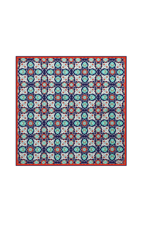 Geleneksel mirasımızın en özel desenleri modern yorumlar eşliğinde ipek ile buluşuyor.Kadınların vazgeçilmez tutkusu eşsiz dokumayla işlenen Türk Motifli Lacivert Kırmızı renkli benzersiz Çini Sarmal desenli ipek mendil modelimiz; kalın, yumuşak ve ferah bir dokunuşla size hem konforu hem de gelenekselleşen şıklığı sunuyor.Ürünümüz; %100 İpek içeriği ile 55x55cm boyutlarıyla kullanım rahatlığı sunuyor.