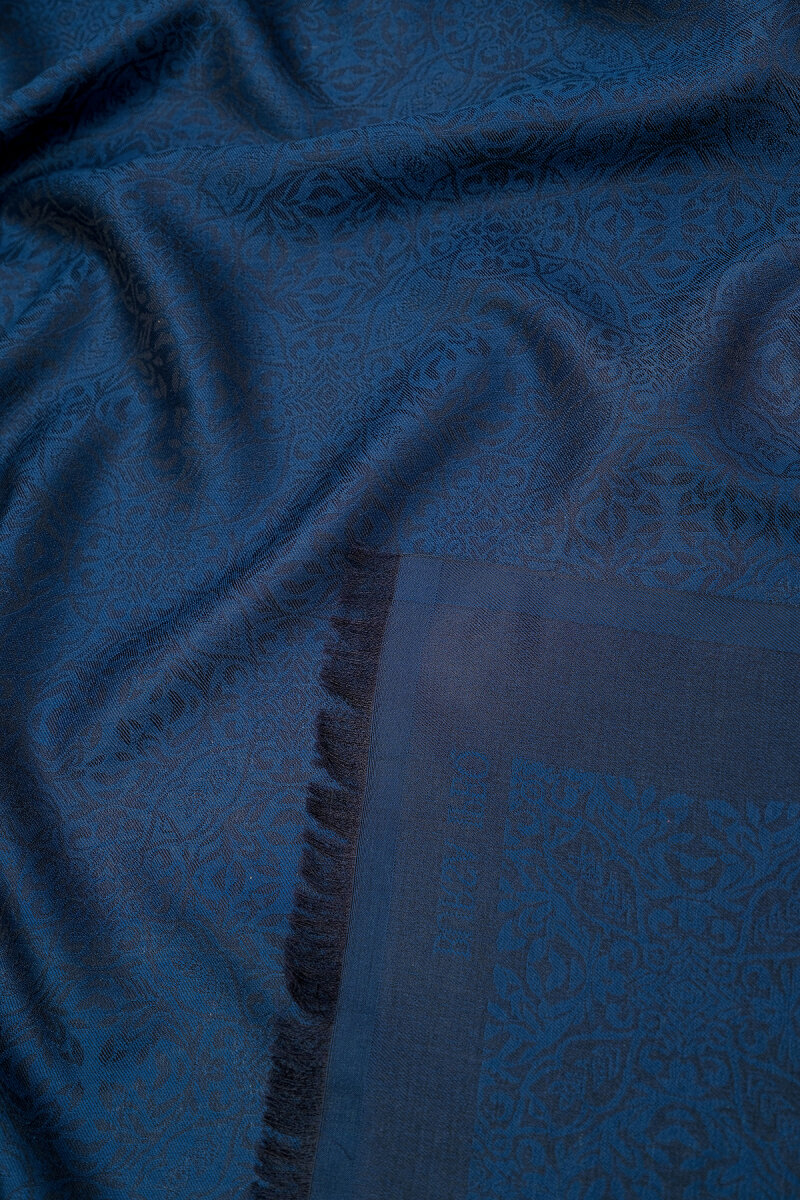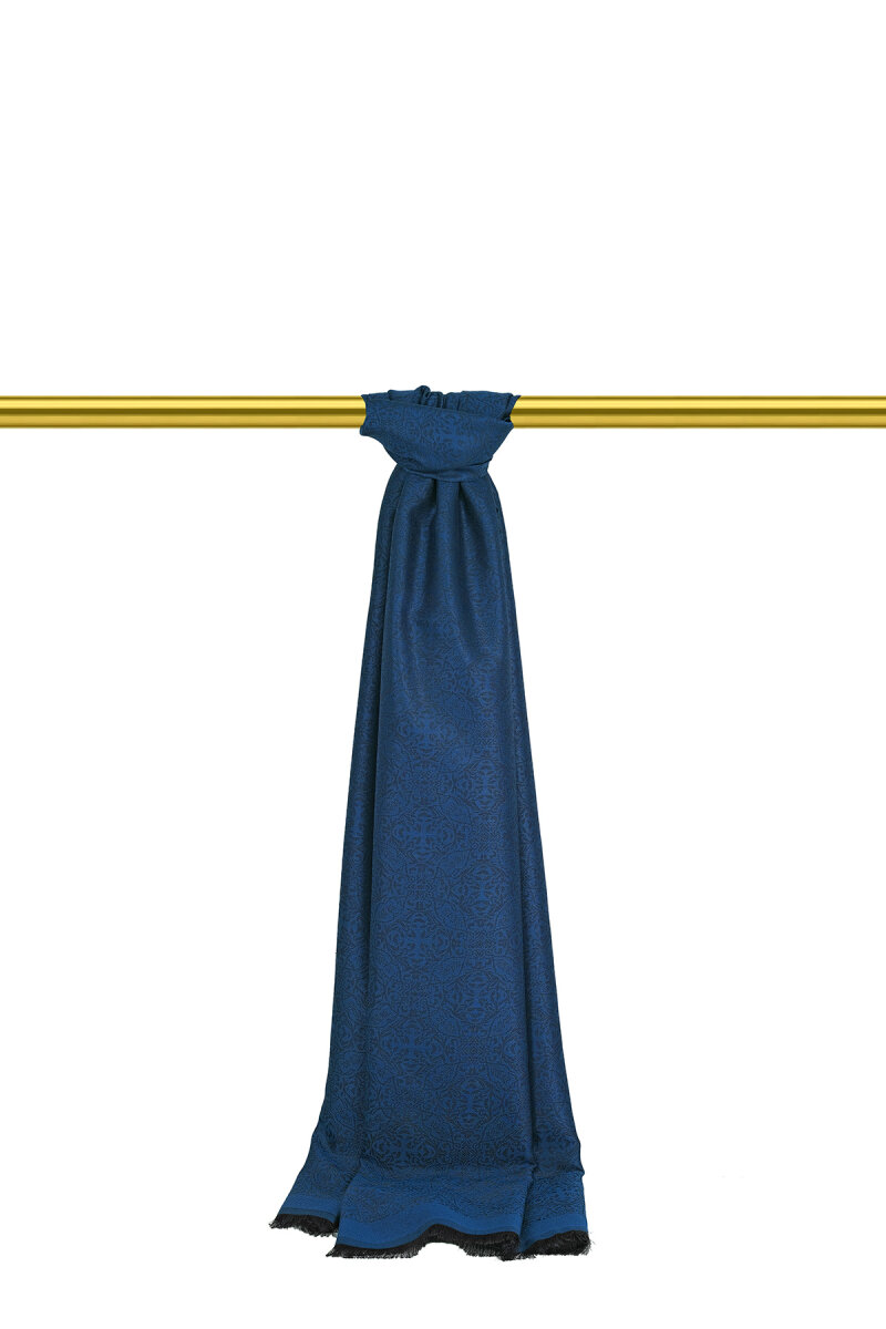 Gece Mavi Damask Desen Jakarlı İpek Şal