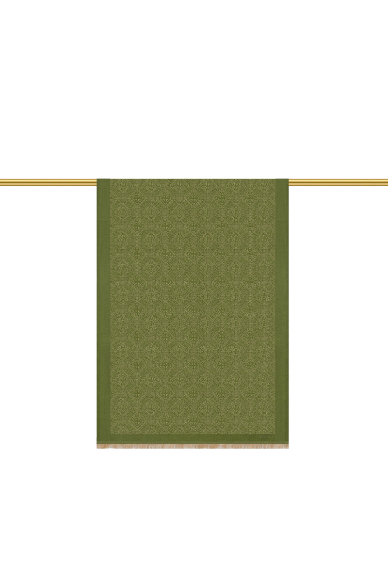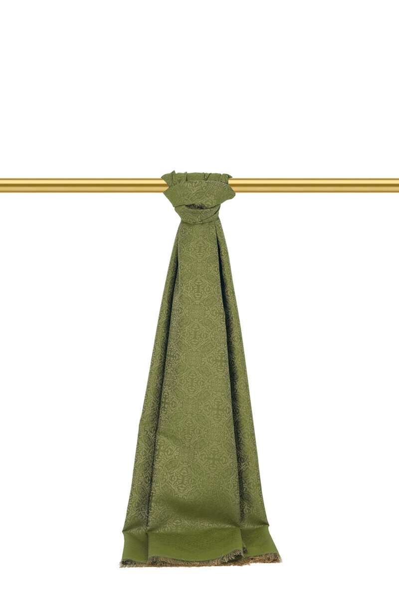 Haki Damask Desen Jakarlı İpek Şal
