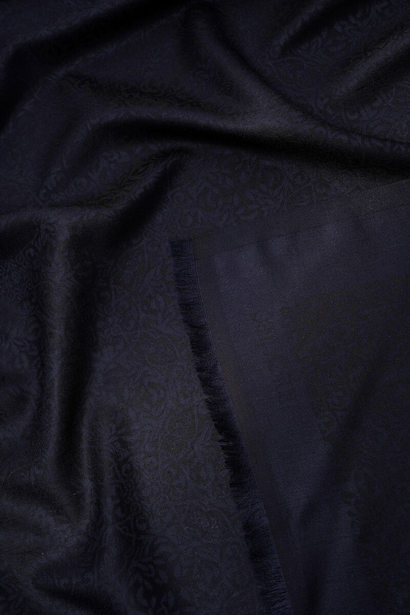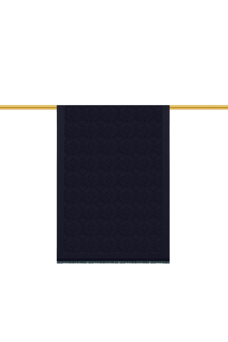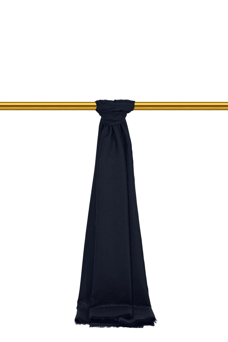 Koyu Lacivert Damask Desen Jakarlı İpek Şal