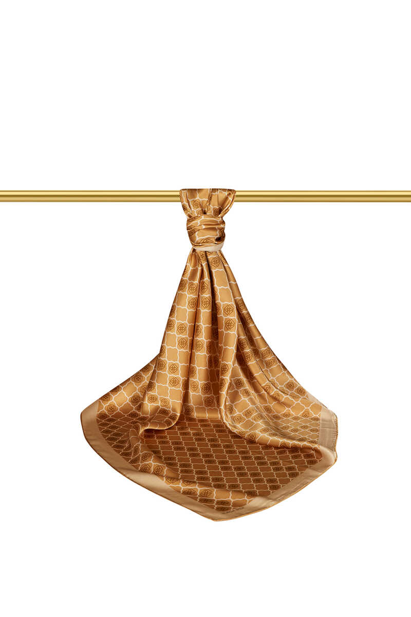 Dark Gold monogamous patterned silk Square Scarf, which is a timeless companion to your classic and sports style; With its upright and solid stance and bright appearance, it adds value to you in the glittering world of fashion. It offers comfort of use with its 100% Silk content and 90x90cm dimensions.