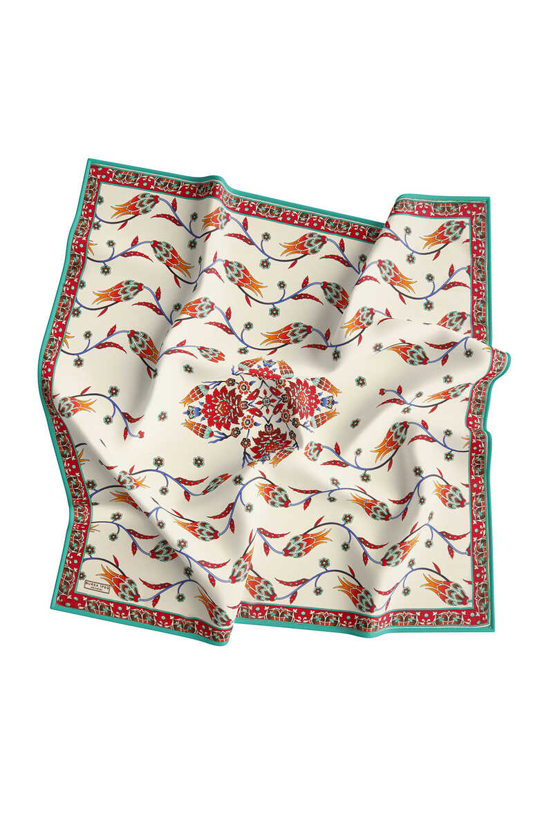 fun and classic choice in which the Ecru Petrol colored Row Tulip pattern comes together with the silk fabric texture and bright and vibrant colors… Add energy to life with the flowers as they are wrapped in silk! Our product: 100% Silk fabric offers ease of use with its dimensions of 90x90cm.