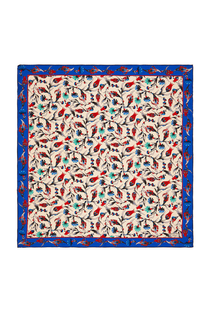 Ecru Sax-colored Carnation Tulip pattern is a fun and classic choice where silk fabric texture and bright and lively colors come together... Add energy to life with the flowers as they are wrapped in silk! Our product: 100% Silk fabric offers ease of use with its dimensions of 90x90cm.