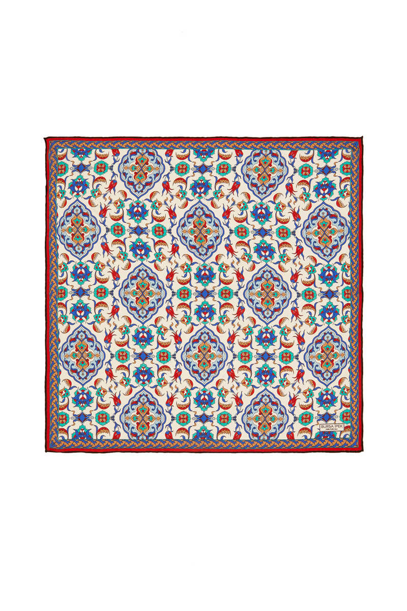 The most special patterns of our traditional heritage meet with silk accompanied by modern interpretations. The indispensable passion of women, our Turkish Pattern Ecru Gold colored unique Tile Tulip pattern silk Pocket Square model embroidered with unique weaving; It offers you both comfort and traditional elegance with a thick, soft and spacious touch. It offers comfort of use with its 100% silk content and 55x55cm dimensions.
