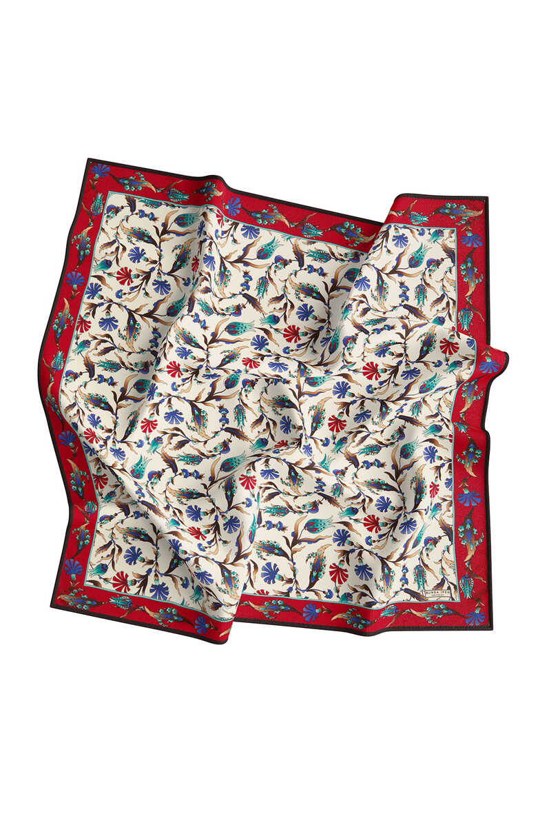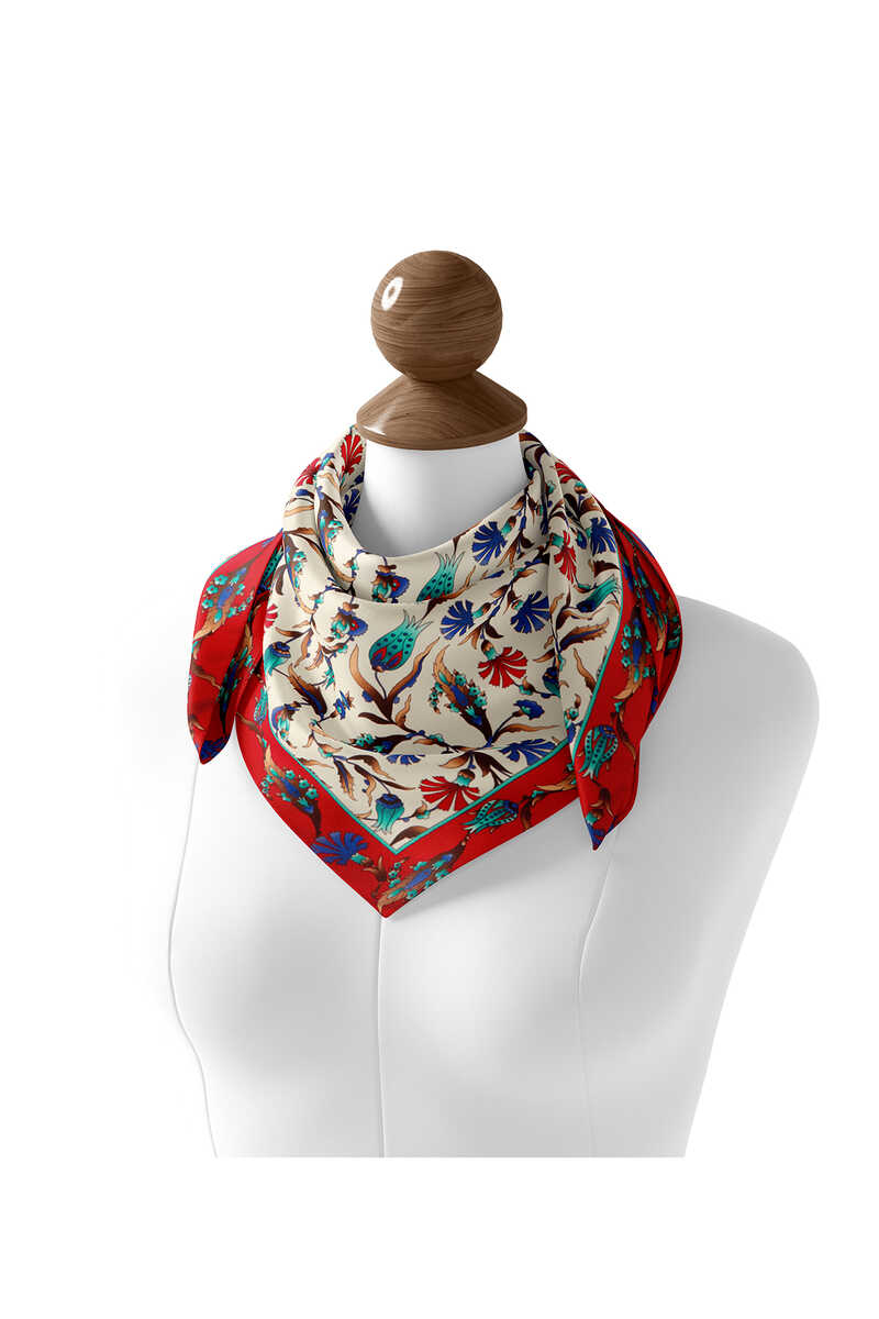 Ekru Kırmızı renkli Karanfil Lale deseninin ipek kumaş dokusu ile parlak ve canlı renklerle bir araya geldiği eğlenceli ve aynı zamanda klasik bir seçim… Çiçeklerin ipeğe büründüğü halleri ile hayata enerji katın! Ürünümüz: %100 İpek kumaşı, 90x90cm boyutlarıyla kullanım kolaylığı sunuyor.