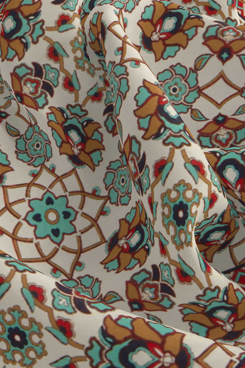 Geleneksel mirasımızın en özel desenleri modern yorumlar eşliğinde ipek ile buluşuyor.Kadınların vazgeçilmez tutkusu eşsiz dokumayla işlenen Türk Motifli Ekru Taba renkli benzersiz Motif desenli ipek mendil modelimiz; kalın, yumuşak ve ferah bir dokunuşla size hem konforu hem de gelenekselleşen şıklığı sunuyor.Ürünümüz; %100 İpek içeriği ile 55x55cm boyutlarıyla kullanım rahatlığı sunuyor.
