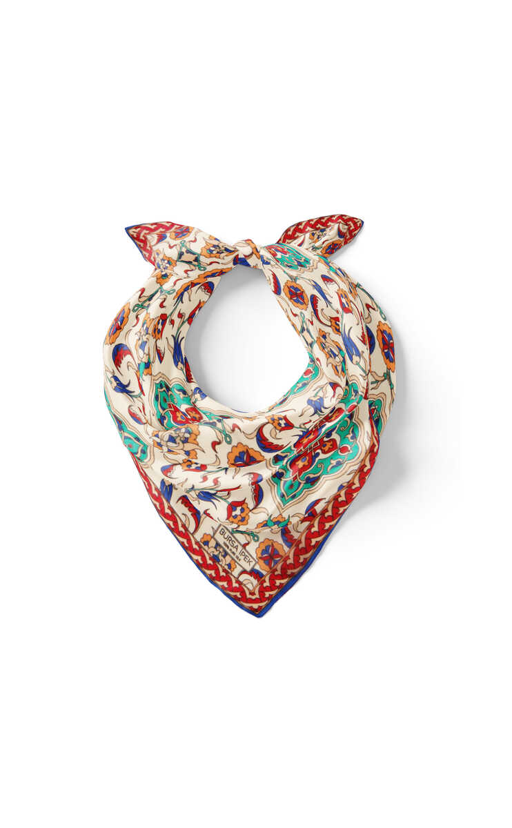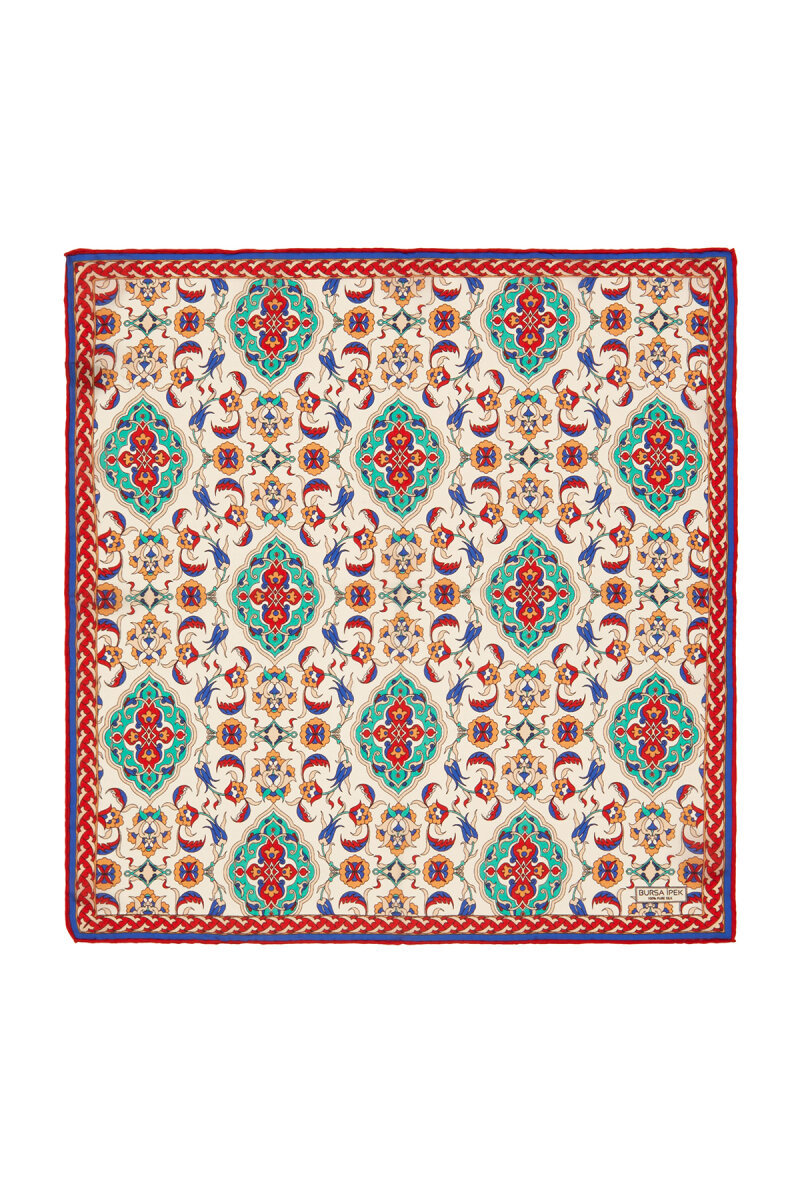Geleneksel mirasımızın en özel desenleri modern yorumlar eşliğinde ipek ile buluşuyor.Kadınların vazgeçilmez tutkusu eşsiz dokumayla işlenen Türk Motifli Ekru Turkuaz renkli benzersiz Çini Lale desenli ipek mendil modelimiz; kalın, yumuşak ve ferah bir dokunuşla size hem konforu hem de gelenekselleşen şıklığı sunuyor.Ürünümüz; %100 İpek içeriği ile 55x55cm boyutlarıyla kullanım rahatlığı sunuyor.