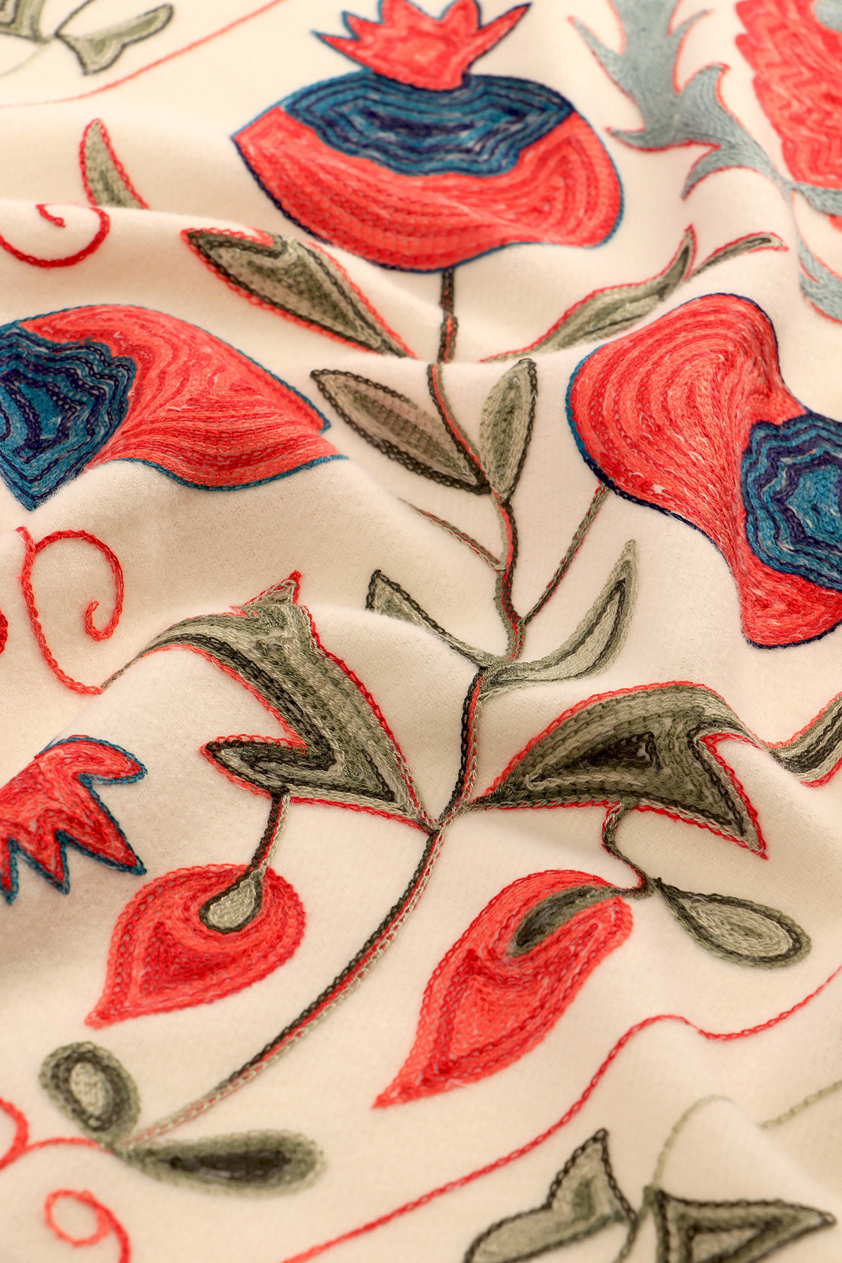 Our Cream Embroidered Winter Shawls, carefully crafted to keep you warm on chilly winter days, stand out with their striking red and blue colors and patterns. Made of acrylic and measuring 70x190 cm, they offer ease of use.