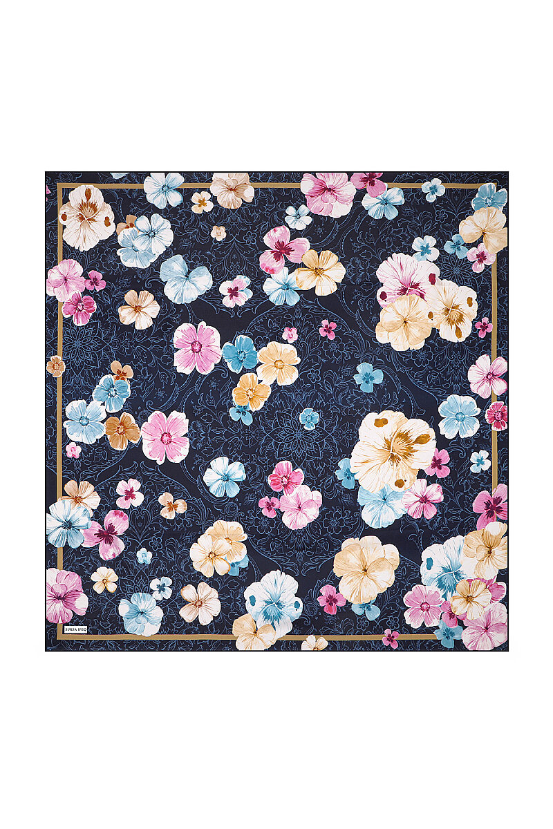 Lacivert Gelincik Desen Çift Taraflı Twill İpek Eşarp