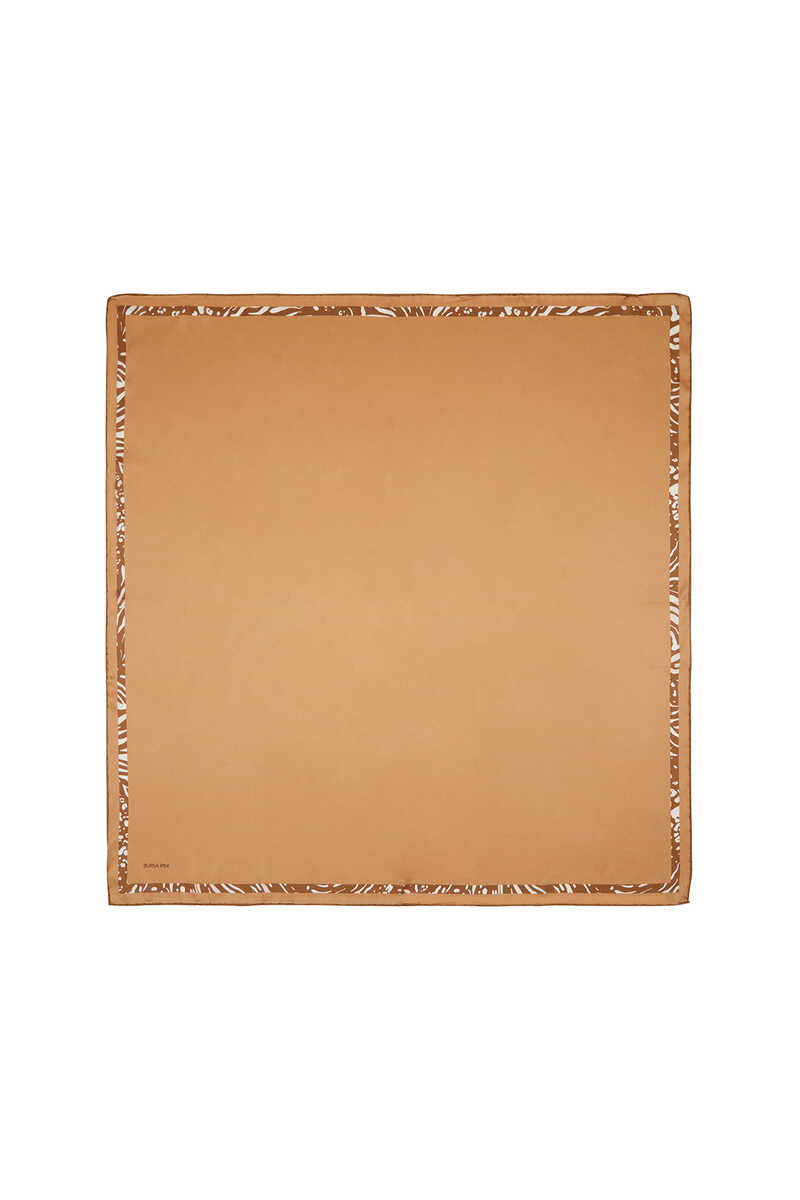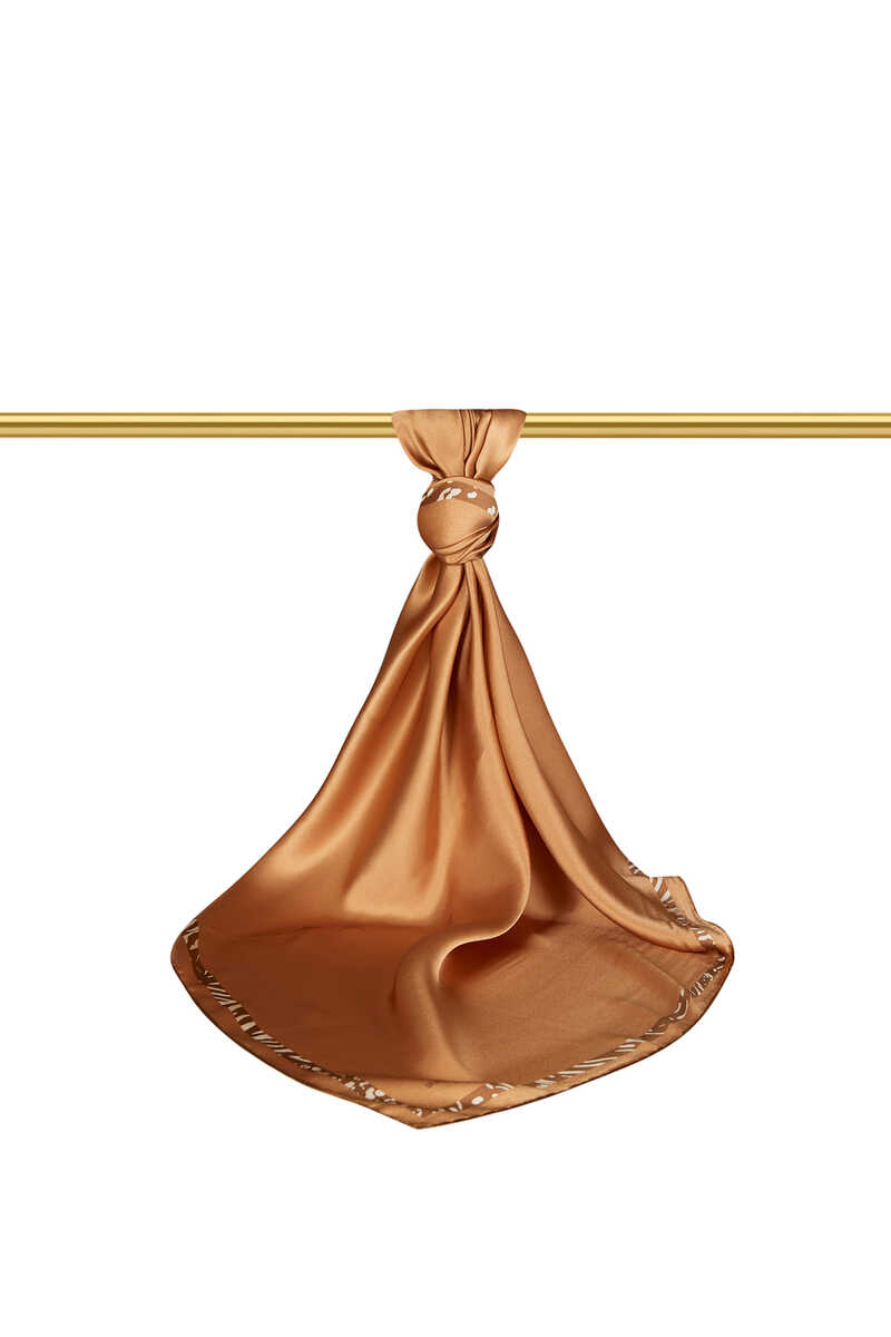 Crowning your plain and simple look, the silk Square Scarf with an upright and full stance in Gold color, with a watery edge, Zebra patterned silk, appeals to all seasons with its wide color range in its design that is far from all details and symbolizes the emphasis of simplicity. It offers comfort of use with its 100% Silk content and 90x90cm dimensions.
