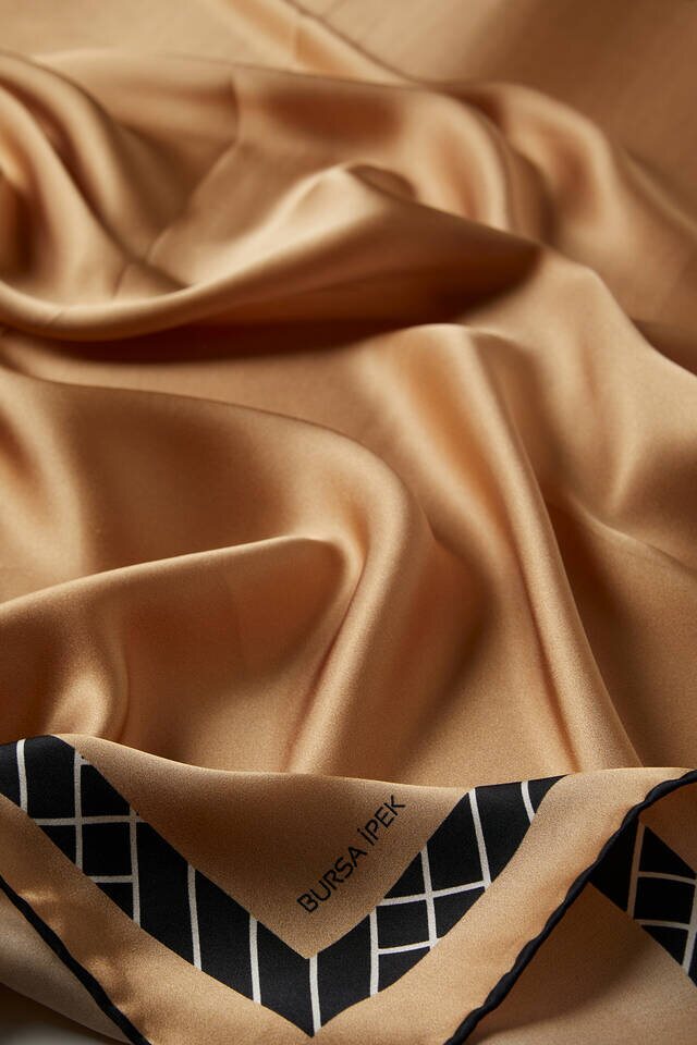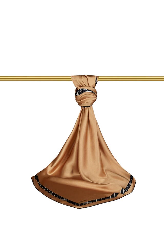 Crowning your plain and simple look, the silk Square Scarf with an upright and full stance in Gold color with Watery Edge Line pattern appeals to all seasons with its wide color range in its design that is far from all details and symbolizes the emphasis of simplicity. It offers comfort of use with its 100% Silk content and 90x90cm dimensions.