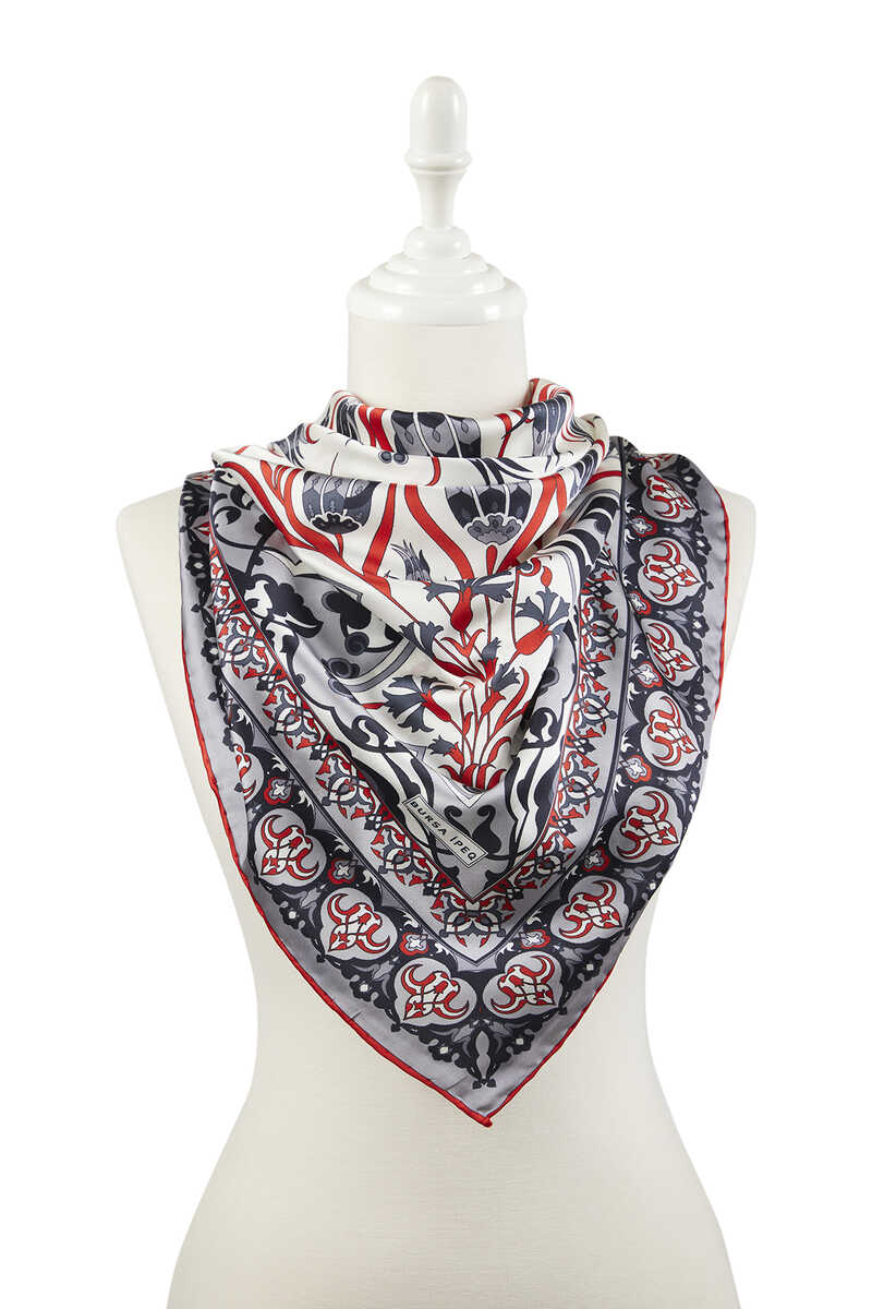Gri Kırmızı Çintemani Karanfil desenlerinin ipeksi kumaş dokusu ile parlak ve canlı renklerle bir araya geldiği eğlenceli ve aynı zamanda klasik bir seçim… Çiçeklerin ipeksi dokuya büründüğü halleri ile hayata enerji katın! Ürünümüz: %100 ipeksi rayon kumaşı, 90x90 cm boyutlarıyla kullanım kolaylığı sunuyor.