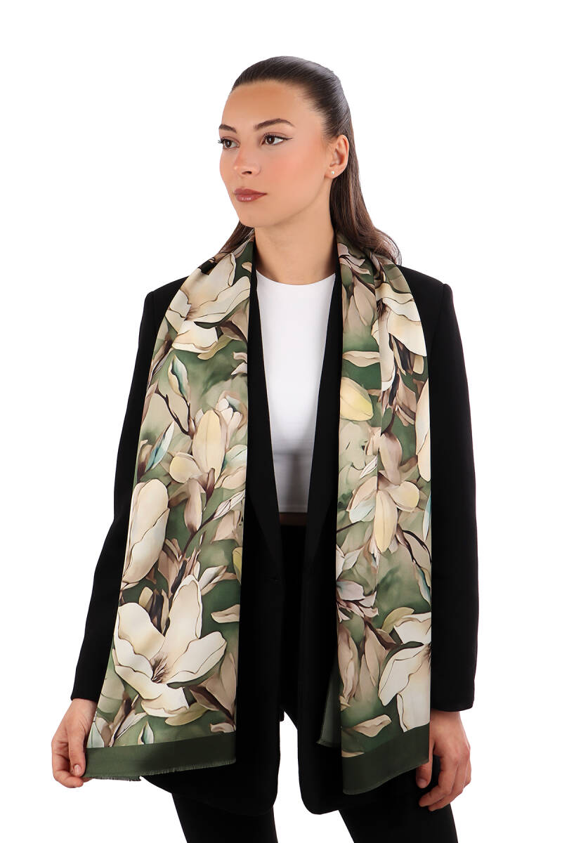 Şıklığınıza şıklık katarken, en ciddi iş toplantısından en zarif sanat galerisine kadar stilinizi tamamlayacak özel bir model. Göz alıcı desenlere sahip Haki Nergis Desen İpek Fular modelimiz, %100 ipek içeriği, 45x160cm boyutlarıyla kullanım kolaylığı sunuyor.