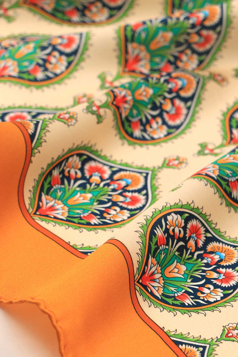 İpeğin eşsiz zarafetine yansıtılmış Hardal Hatai Desen Sura İpek Eşarp ile sizler de farklı güzellikteki bütünlüğün atmosferini hissedeceksiniz. Ürünümüz; %100 İpek içeriği ile 90x90cm boyutlarıyla kullanım rahatlığı sunuyor.