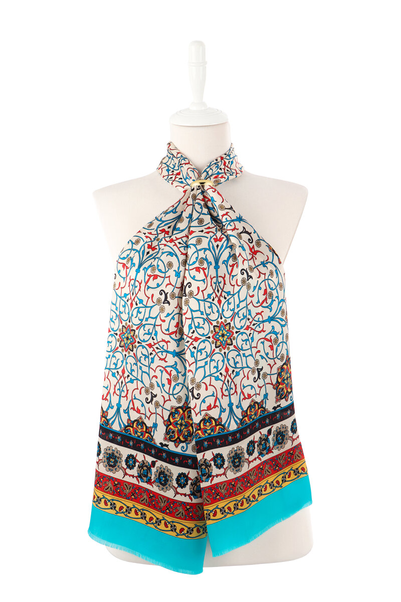 special model that will add a touch of elegance to your look, complementing your style from the most serious business meeting to the most elegant art gallery. Our eye-catching Turquoise Ivy Pattern Narrow Silk Scarf, with its 100% silk content and 45 x 165 cm dimensions, offers ease of use.