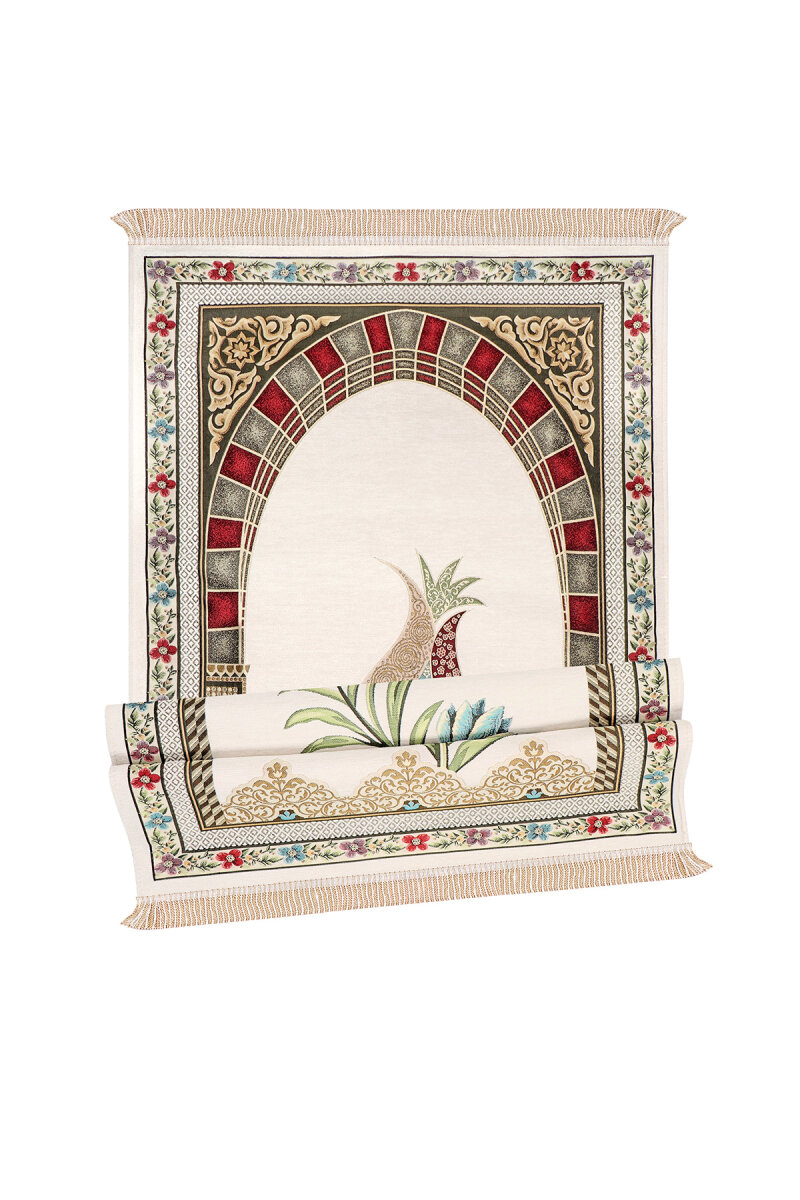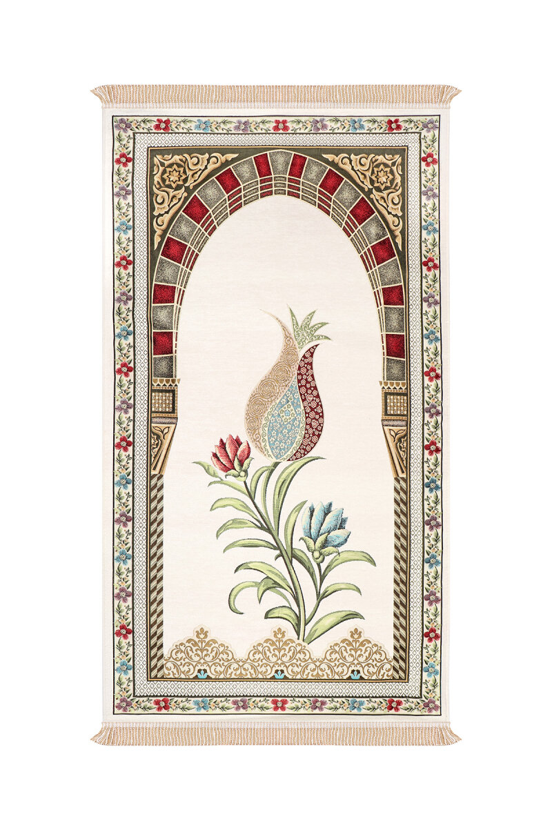 Krem Mihrap Lale Desen Kabartmalı Özel Dokuma Seccade