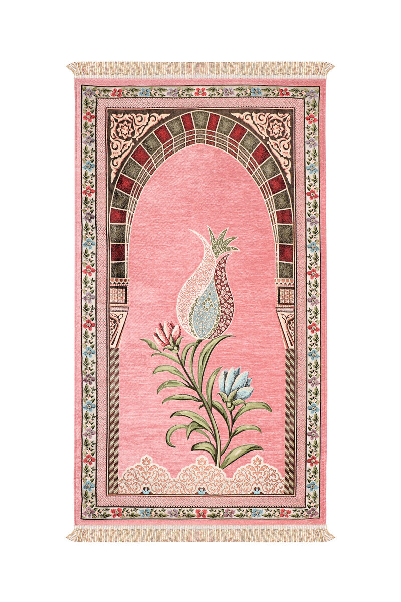 Pembe Mihrap Lale Desen Kabartmalı Özel Dokuma Seccade