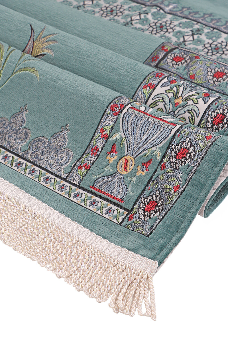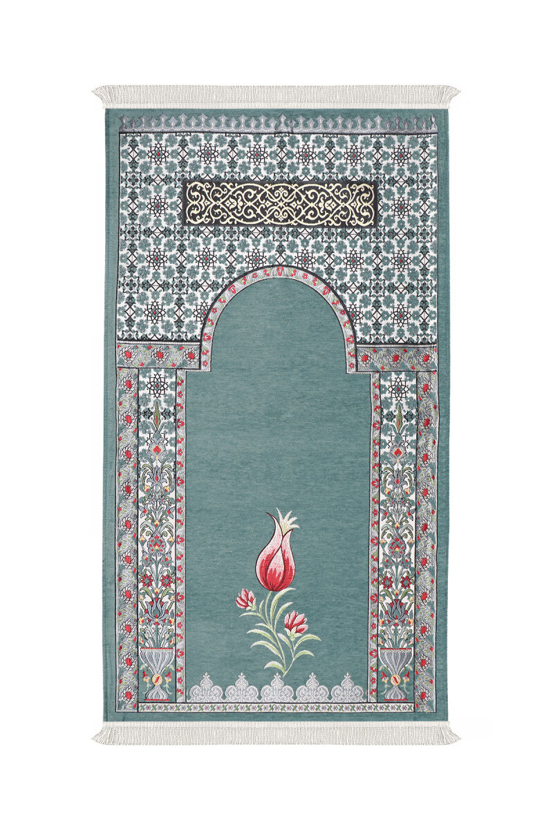 Klasik Osmanlı sanatından ilham alan lale motifleriyle tasarlanan bu özel seccade, zarif detayları ve estetik duruşuyla ibadet alanınıza şıklık katar.Ürünümüz şönil pamuk içeriği ve 65 x 110 cm ebatları ile kullanım kolaylığı sunmaktadır.