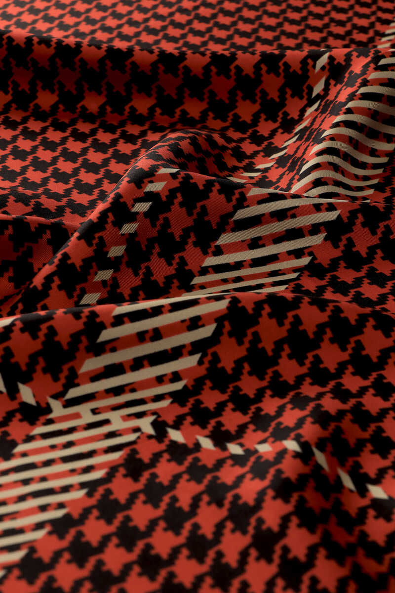 İpeğin eşsiz zarafetine yansıtılmış Kırmızı Çizgi Kazayağı Desen Twill İpek Eşarp ile sizler de farklı güzellikteki bütünlüğün atmosferini hissedeceksiniz. Ürünümüz; %100 İpek içeriği ile 90x90cm boyutlarıyla kullanım rahatlığı sunuyor.