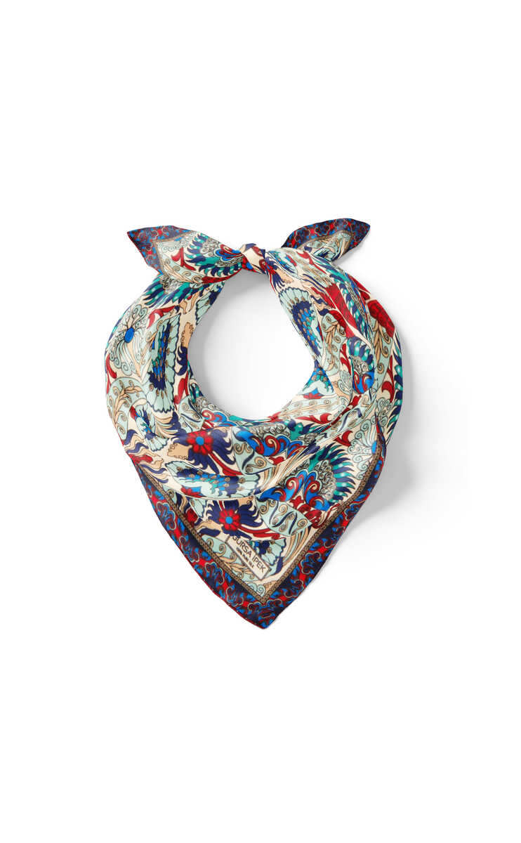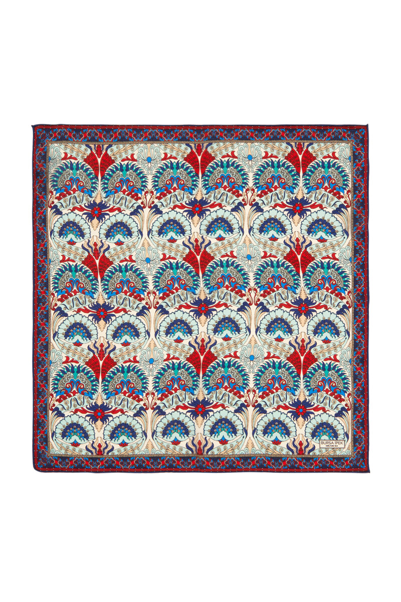 Geleneksel mirasımızın en özel desenleri modern yorumlar eşliğinde ipek ile buluşuyor.Kadınların vazgeçilmez tutkusu eşsiz dokumayla işlenen Türk Motifli Kırmızı Turkuaz renkli benzersiz Tavuskuşu desenli ipek mendil modelimiz; kalın, yumuşak ve ferah bir dokunuşla size hem konforu hem de gelenekselleşen şıklığı sunuyor.Ürünümüz; %100 İpek içeriği ile 55x55cm boyutlarıyla kullanım rahatlığı sunuyor.