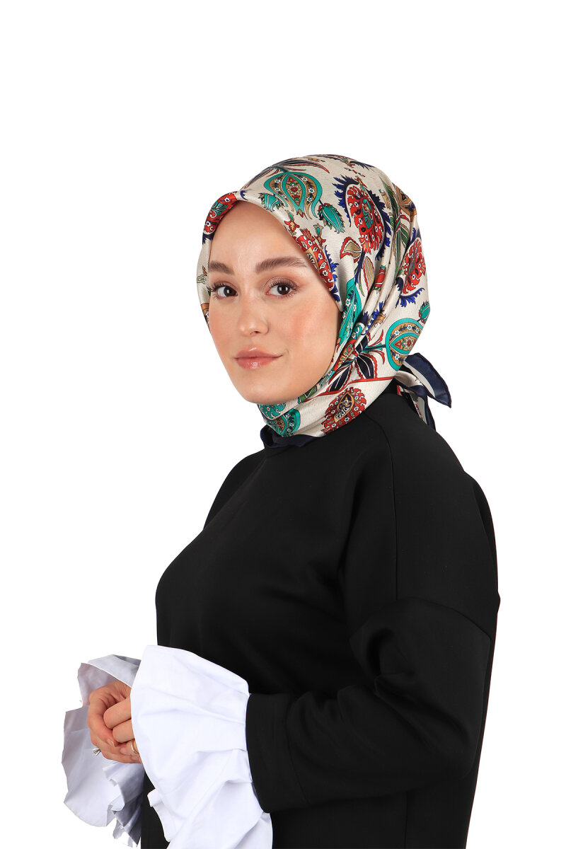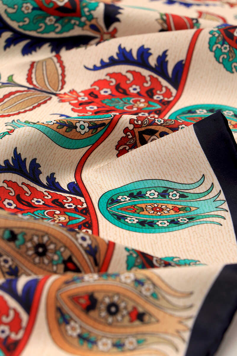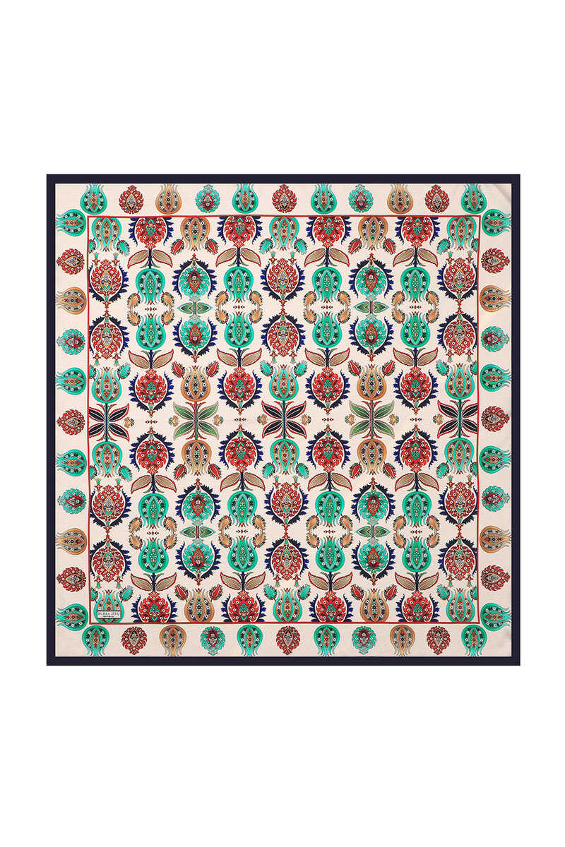 İpeğin eşsiz zarafetine yansıtılmış Lacivert İznik Desen Sura İpek Eşarp ile sizler de farklı güzellikteki bütünlüğün atmosferini hissedeceksiniz. Ürünümüz; %100 İpek içeriği ile 90x90cm boyutlarıyla kullanım rahatlığı sunuyor.