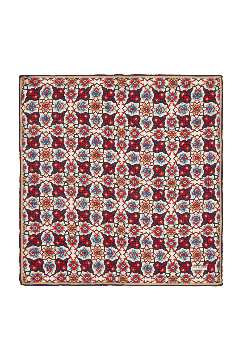 Geleneksel mirasımızın en özel desenleri modern yorumlar eşliğinde ipek ile buluşuyor.Kadınların vazgeçilmez tutkusu eşsiz dokumayla işlenen Türk Motifli Lacivert Kırmızı renkli benzersiz Çini Sarmal desenli ipek mendil modelimiz; kalın, yumuşak ve ferah bir dokunuşla size hem konforu hem de gelenekselleşen şıklığı sunuyor.Ürünümüz; %100 İpek içeriği ile 55x55cm boyutlarıyla kullanım rahatlığı sunuyor.