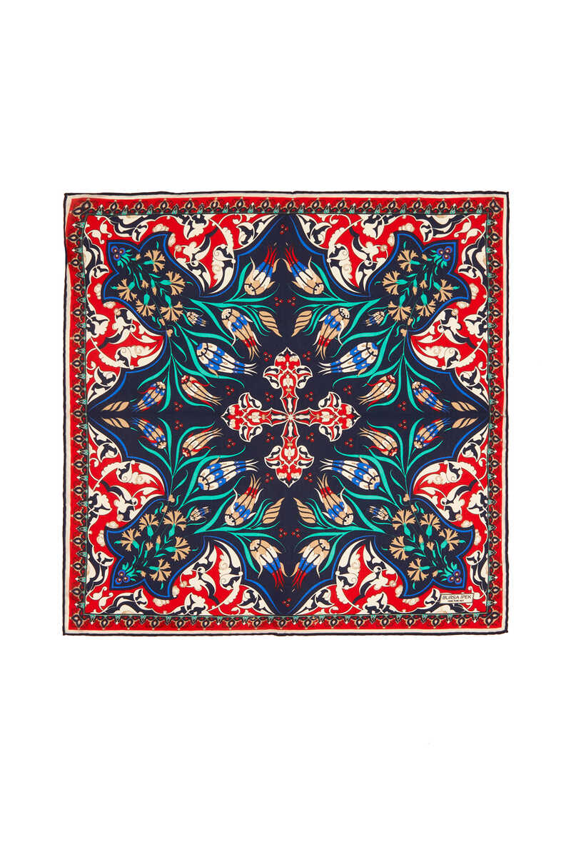Geleneksel mirasımızın en özel desenleri modern yorumlar eşliğinde ipek ile buluşuyor.Kadınların vazgeçilmez tutkusu eşsiz dokumayla işlenen Türk Motifli Lacivert Kırmızı renkli benzersiz Karanfil Lale desenli ipek mendil modelimiz; kalın, yumuşak ve ferah bir dokunuşla size hem konforu hem de gelenekselleşen şıklığı sunuyor.Ürünümüz; %100 İpek içeriği ile 55x55cm boyutlarıyla kullanım rahatlığı sunuyor.