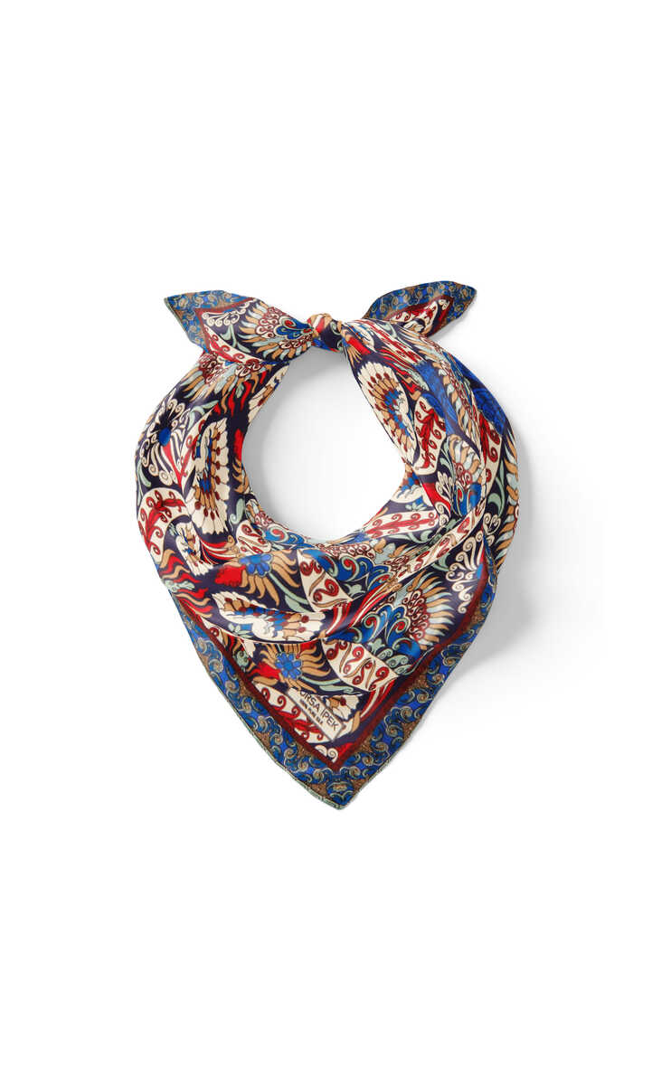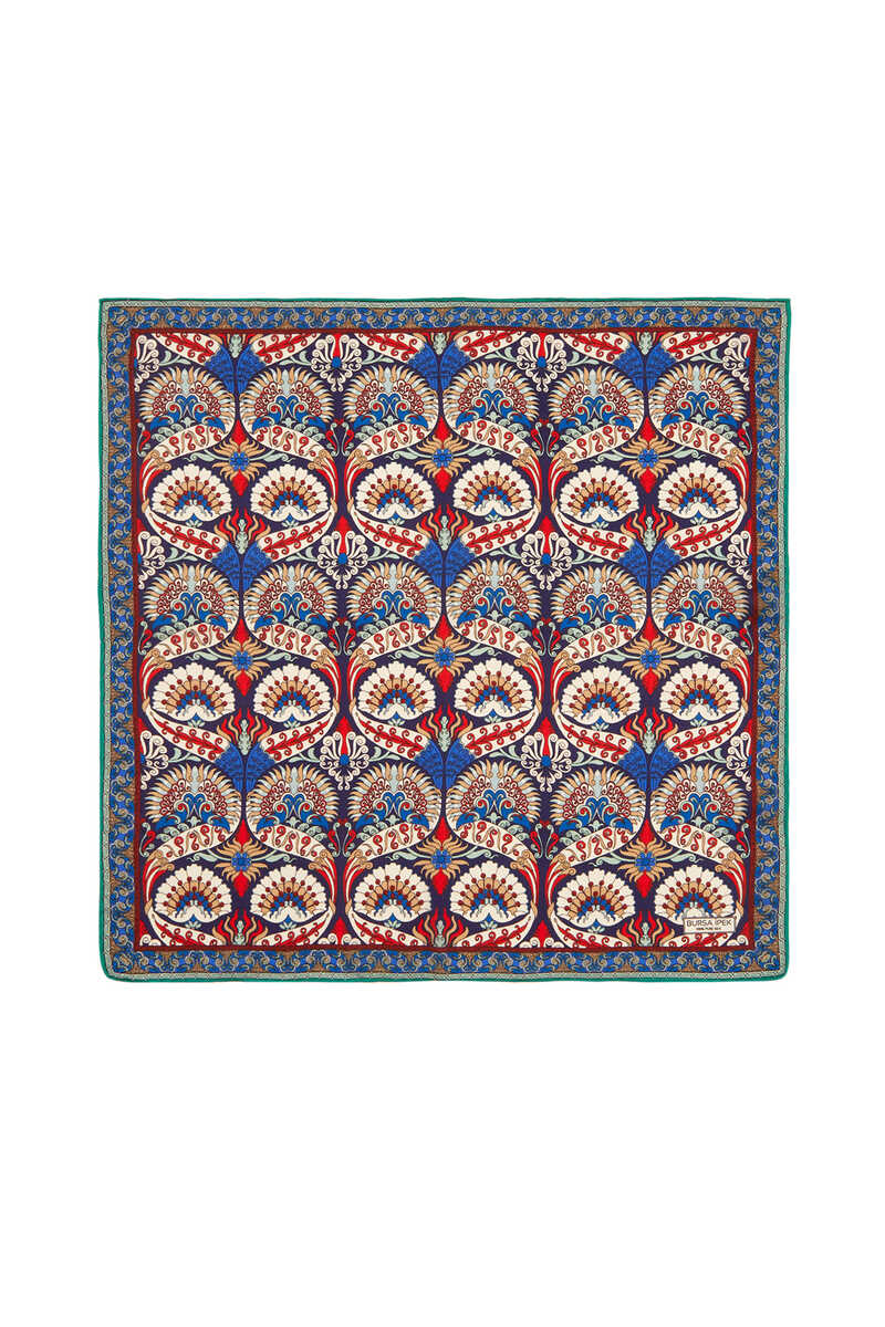 Geleneksel mirasımızın en özel desenleri modern yorumlar eşliğinde ipek ile buluşuyor.Kadınların vazgeçilmez tutkusu eşsiz dokumayla işlenen Türk Motifli Lacivert Kırmızı renkli benzersiz Tavuskuşu desenli ipek mendil modelimiz; kalın, yumuşak ve ferah bir dokunuşla size hem konforu hem de gelenekselleşen şıklığı sunuyor.Ürünümüz; %100 İpek içeriği ile 55x55cm boyutlarıyla kullanım rahatlığı sunuyor.