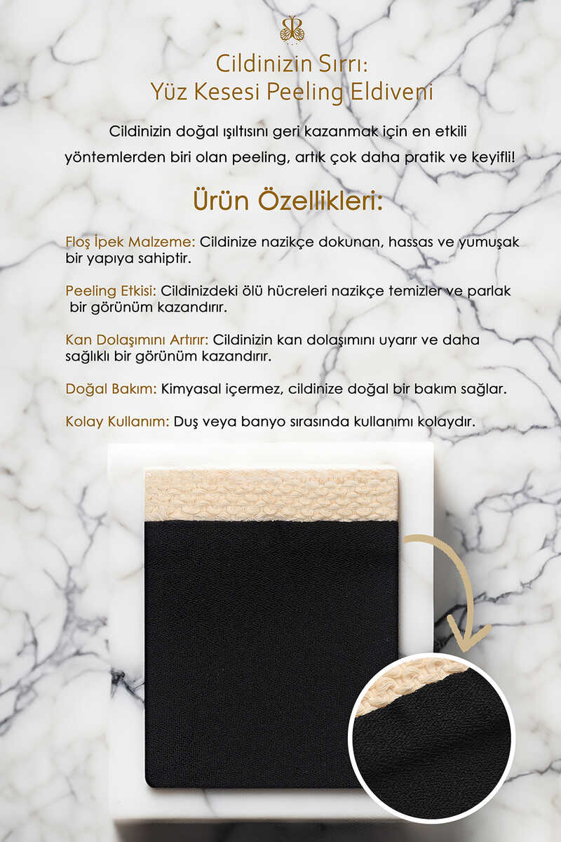 Siyah Yüz Kesesi Peeling Eldiveni ile makyaj öncesi peeling uygulanarak daha etkili makyajlar için yüz arındırılabilir ve makyaj sonrası yüzde biriken makyaj artıkları temizlenebilir. Sürekli ve düzenli kullanımlarda kan dolaşımını hızlandırılarak ölü deriyi atmada ve cildinizi yenilemenize yardımcı olmaktadır. Ürünümüz Floş İpek malzemeden üretilmiştir.
